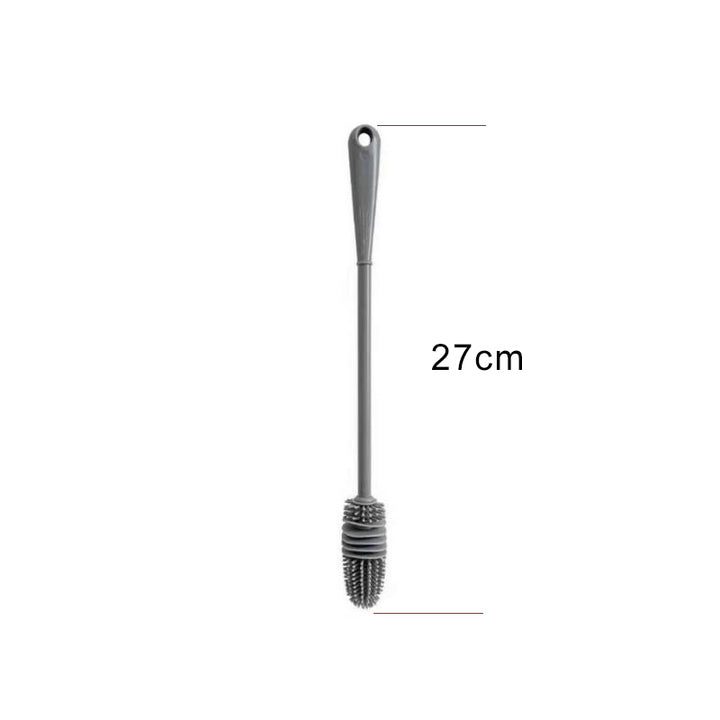 Durable silicone bottle brush with a long handle for easy cleaning of bottles, cups, and glasses. Soft bristles prevent scratches while effectively removing residue. Perfect for kitchens, baby bottles, and drinkware.