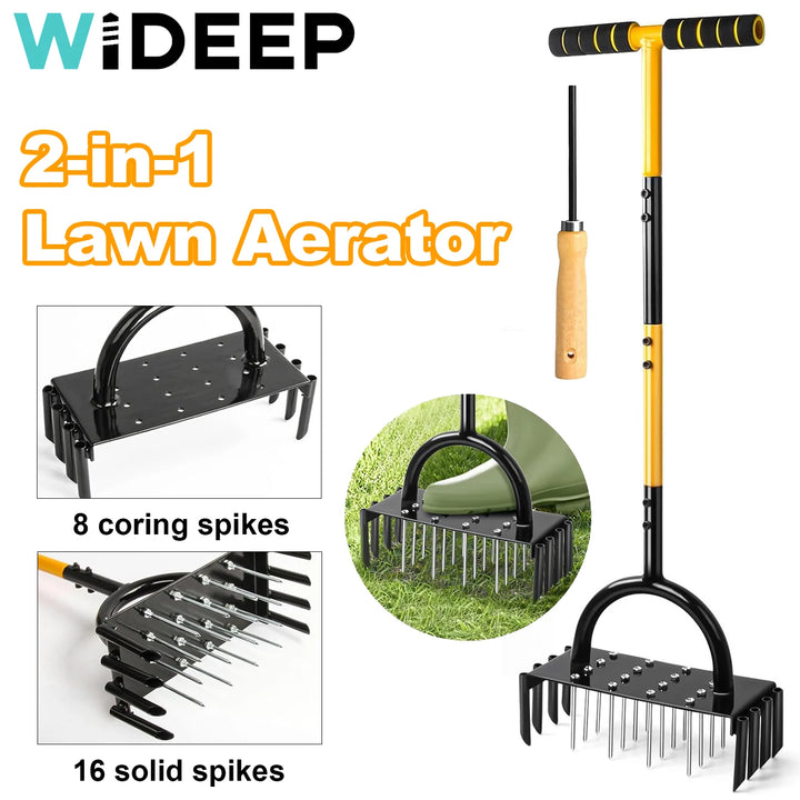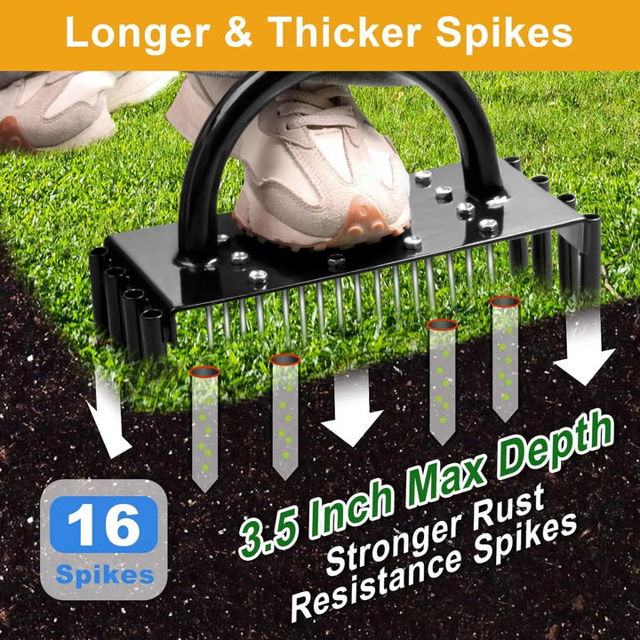 Heavy-duty 2-in-1 manual lawn aerator with 16 metal spikes and 8 corer plugs, perfect for soil aeration in lawns, yards, and gardens. Durable and easy to use for healthy grass growth.