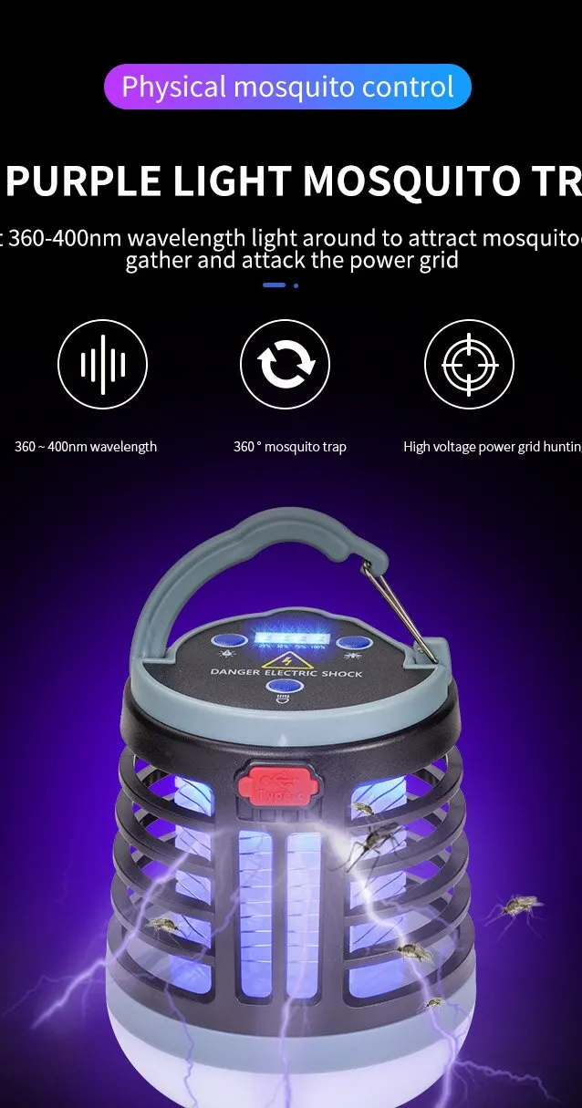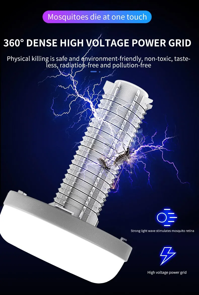 • Electric Shock :The lamp emits an electric shock that kills mosquitoes instantly.