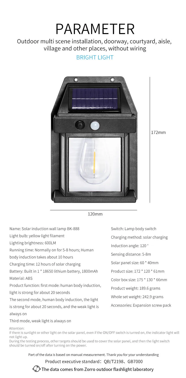 Enhance your outdoor spaces with this motion sensor solar tungsten night lamp. Featuring intelligent lighting with 3 modes, it automatically illuminates when motion is detected. Waterproof and durable, it’s perfect for courtyards, gardens, pathways, and patios. Solar-powered for energy efficiency, this lantern combines style, security, and convenience for your outdoor areas.