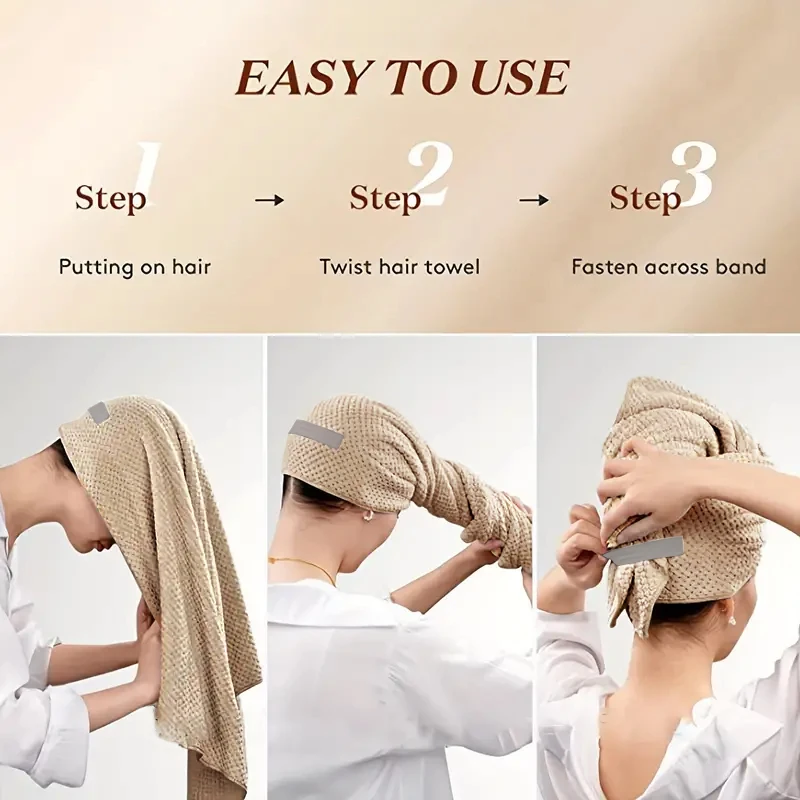 Extra-large microfiber hair towel wrap with elastic band for quick drying. Ultra-soft, absorbent, and gentle on hair, perfect for home, spa, or travel use.