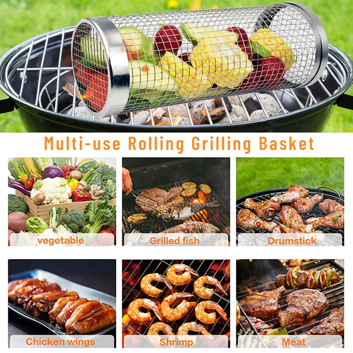 Set of 2 stainless steel rolling grilling baskets designed for easy, even cooking on the grill. Perfect for vegetables, seafood, or small meats—ideal for outdoor barbecues, picnics, and camping adventures.