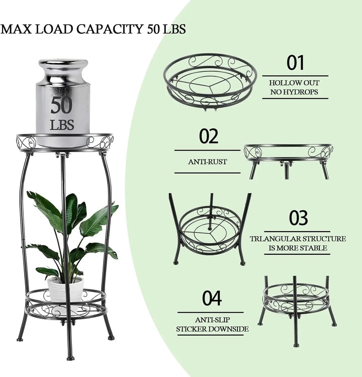 Display your greenery in style with this 2-Pack Tall Plant Stand, featuring a durable black metal frame that is rustproof and stable. Each stand has 2 tiers, 27.1 inches tall, perfect for showcasing multiple plants indoors or outdoors. Ideal for living rooms, patios, balconies, or garden spaces, these plant racks combine modern elegance with practical functionality.