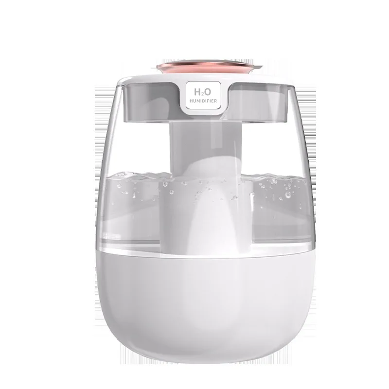 Double spray air humidifier and essential oil diffuser with USB power and LED light. Ideal for home or office, providing moisture and aromatherapy simultaneously.