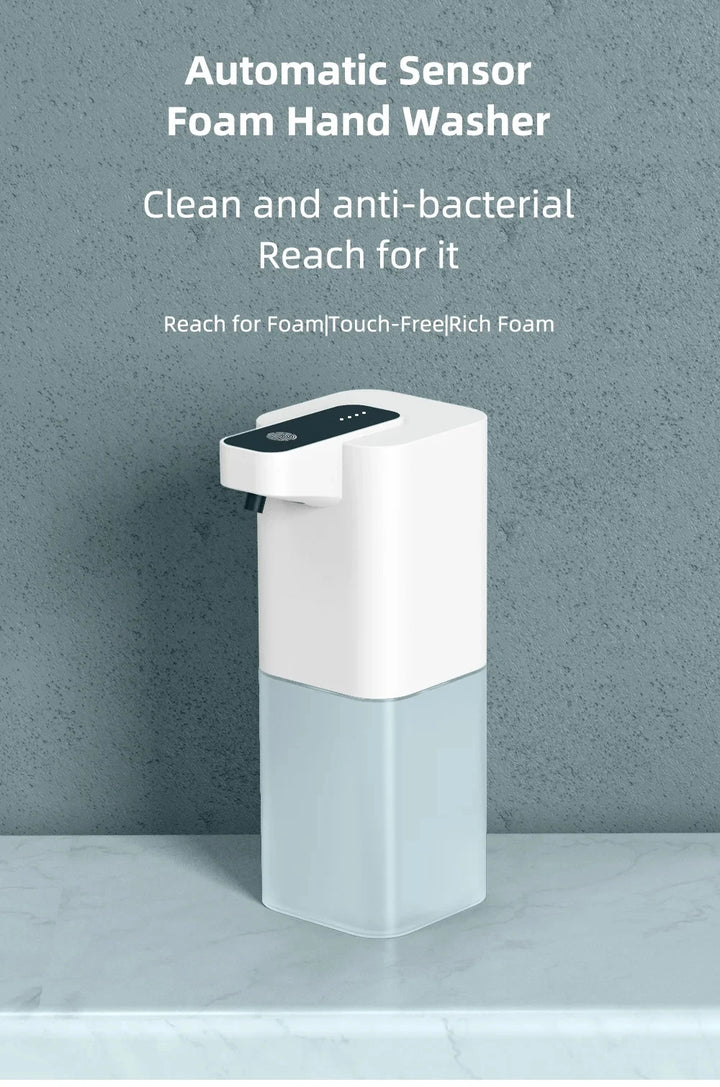 Automatic infrared soap dispenser with USB rechargeable design. Dispenses foam sanitizer or soap touchlessly, ideal for kitchen and bathroom hygiene.