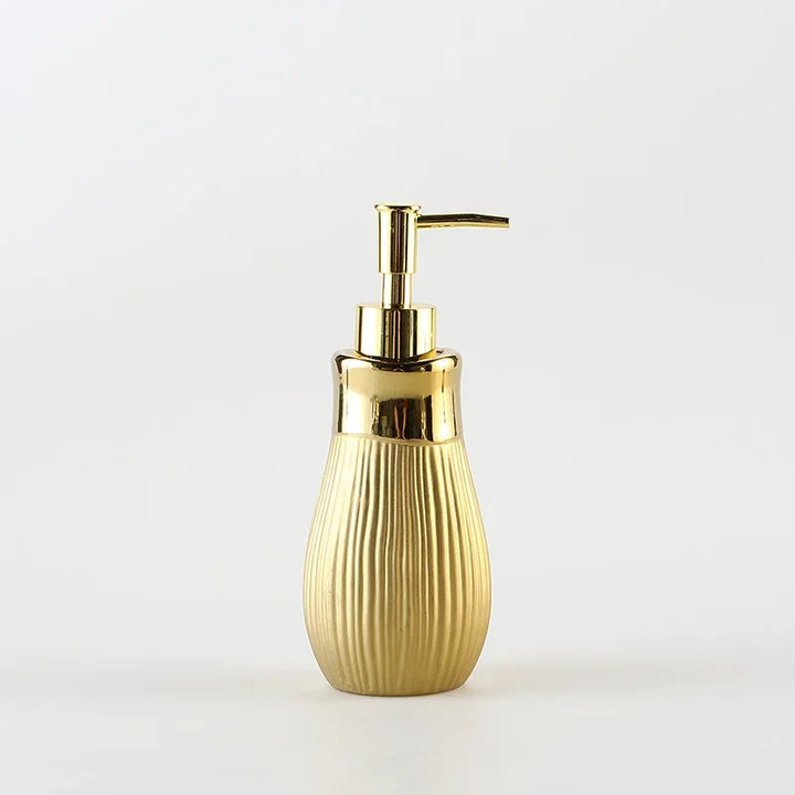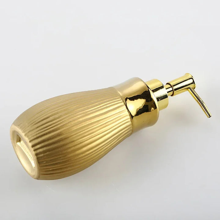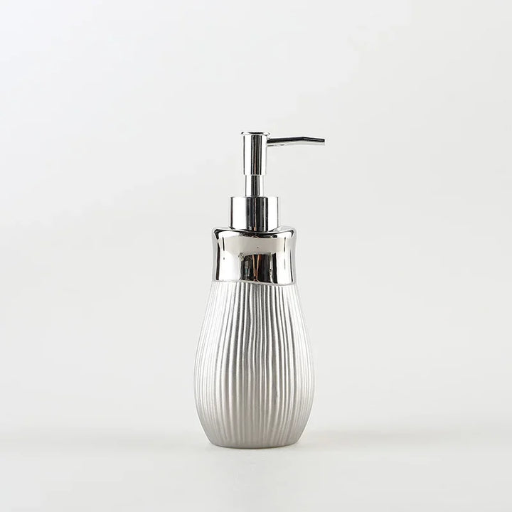 Elegant silver-plated ceramic dispenser for soap, shampoo, sanitizer, or shower gel. Perfect for home, hotel, or bathroom use.