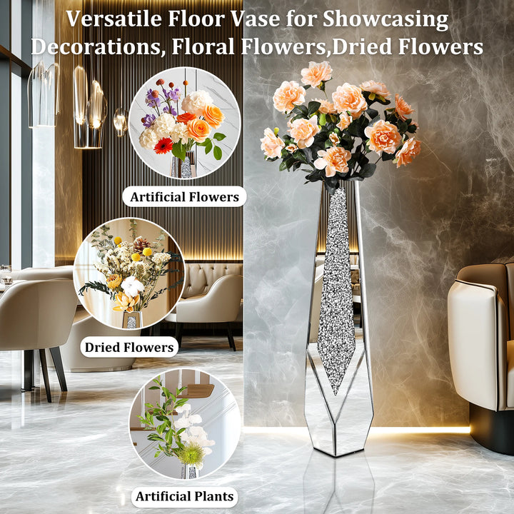 Add a luxurious and modern touch to your space with this tall floor mirror vase. Crafted from crushed diamond glass, it serves as a stunning centrepiece for living rooms, weddings, hotels, or special events. Perfect for flower arrangements or decorative displays, its elegant design reflects light beautifully, creating a sophisticated ambiance.