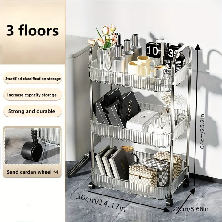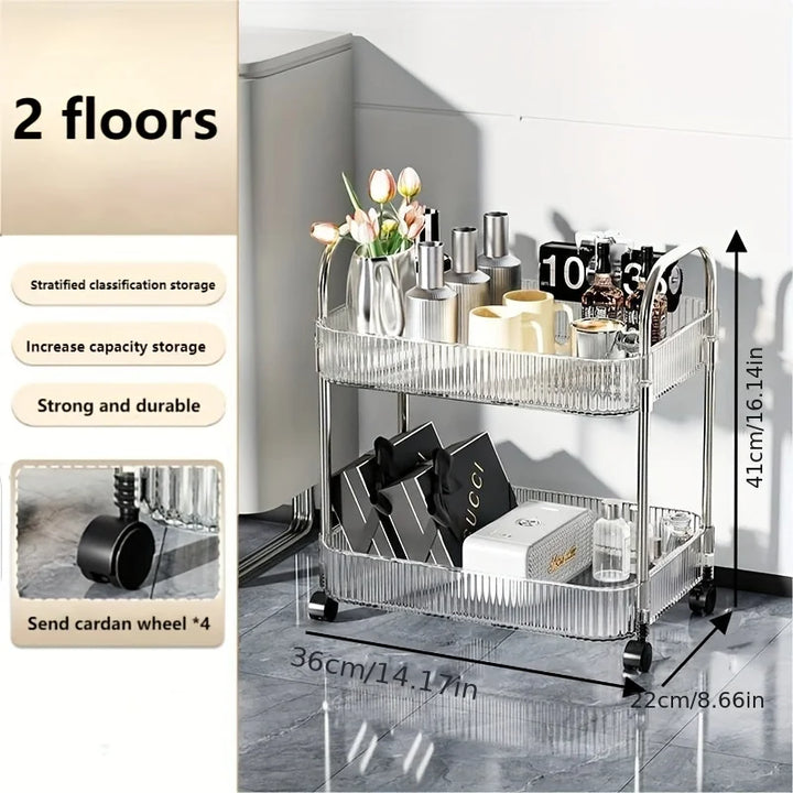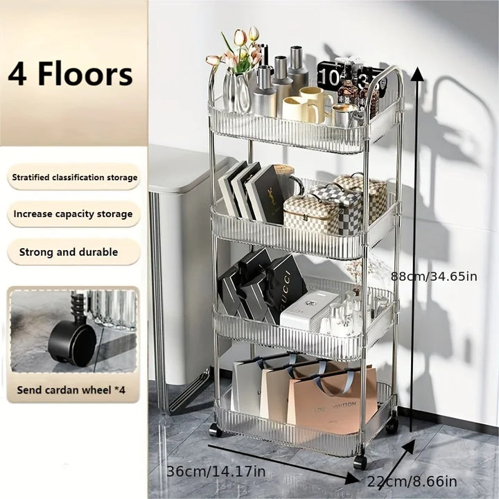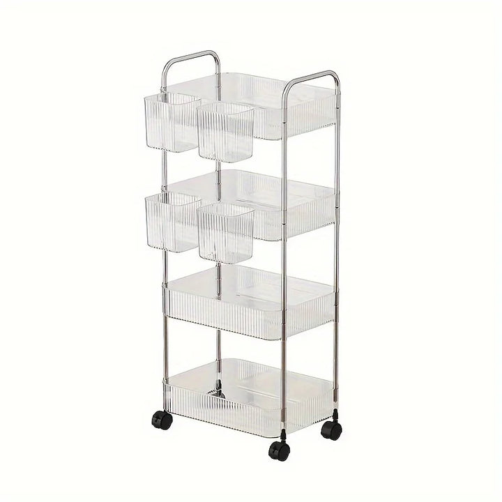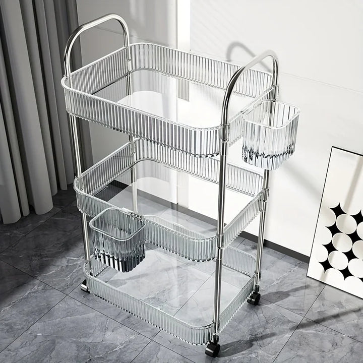 Spacious transparent acrylic storage trolley with smooth-rolling wheels and removable baskets. Multi-layer design ideal for organizing kitchen items, bathroom supplies, or living room accessories. Durable, elegant, and easy to move—perfect for modern homes.