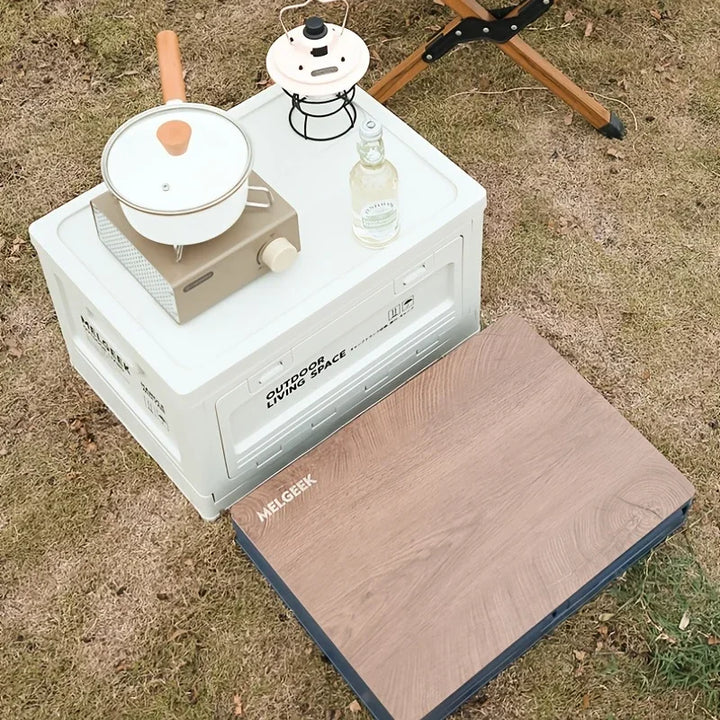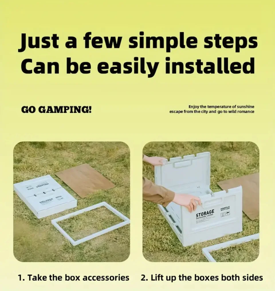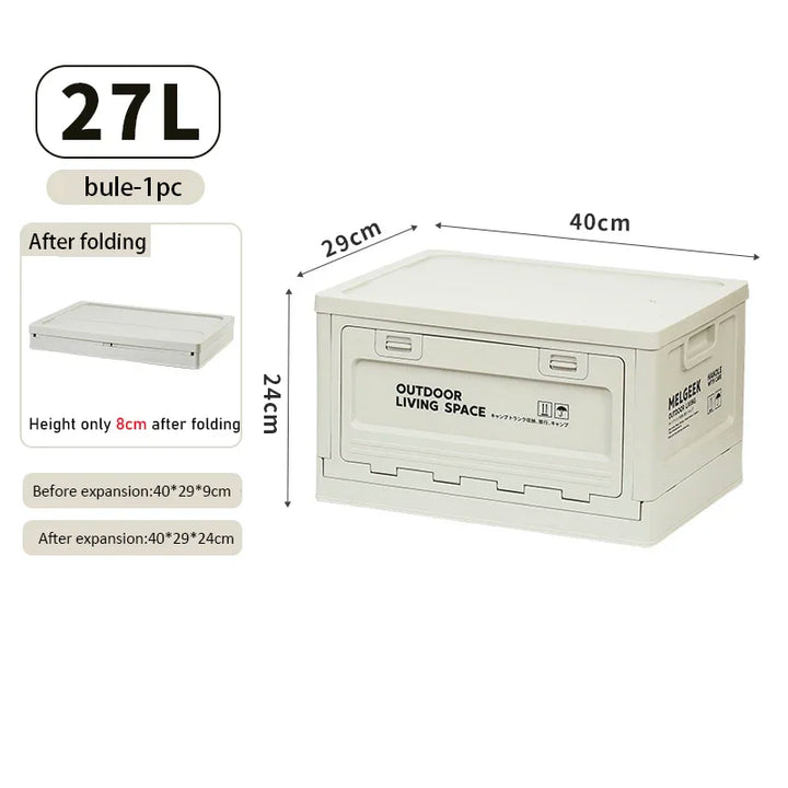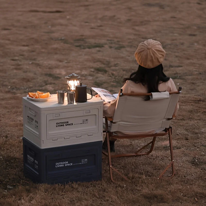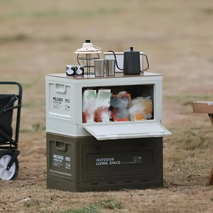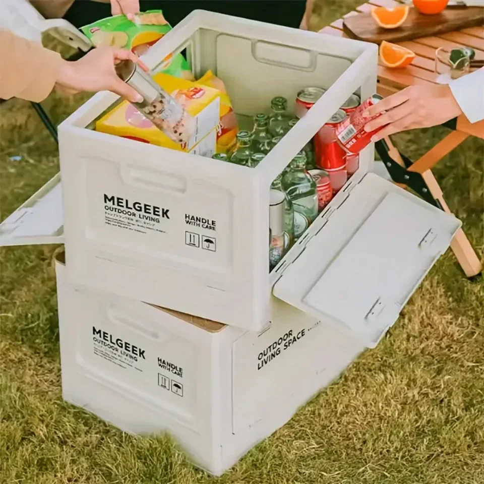 Versatile folding storage box for camping, picnics, and outdoor adventures. Doubles as a trunk organizer and portable stool, perfect for travel and outdoor storage.