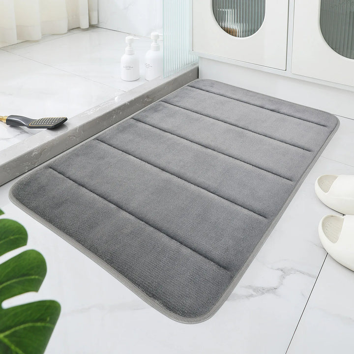 Soft and comfortable coral velvet bath mat with geometric embossed stripes, featuring a non-slip sole and easy hand-wash care, perfect for bathroom floors.