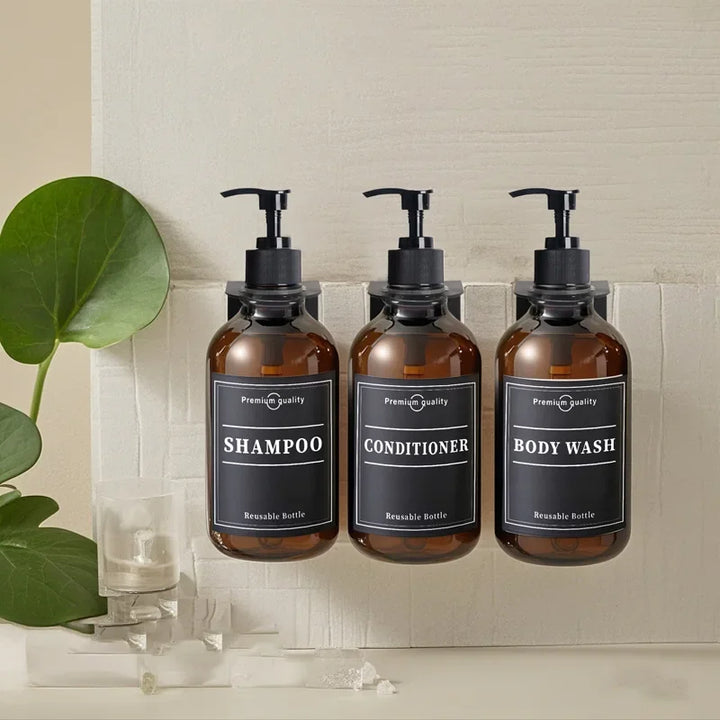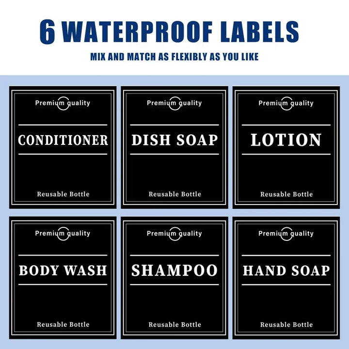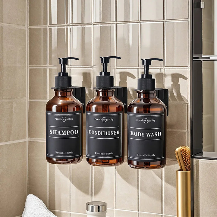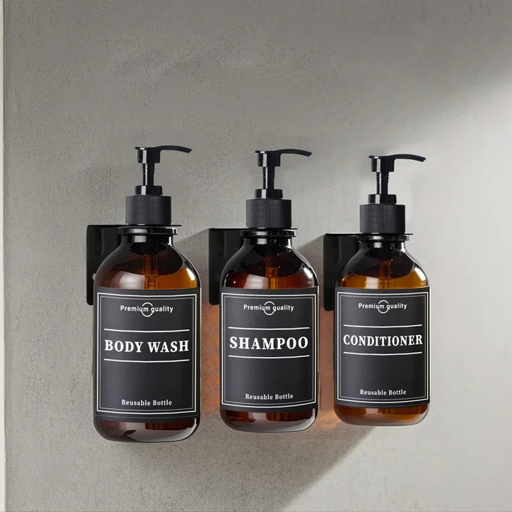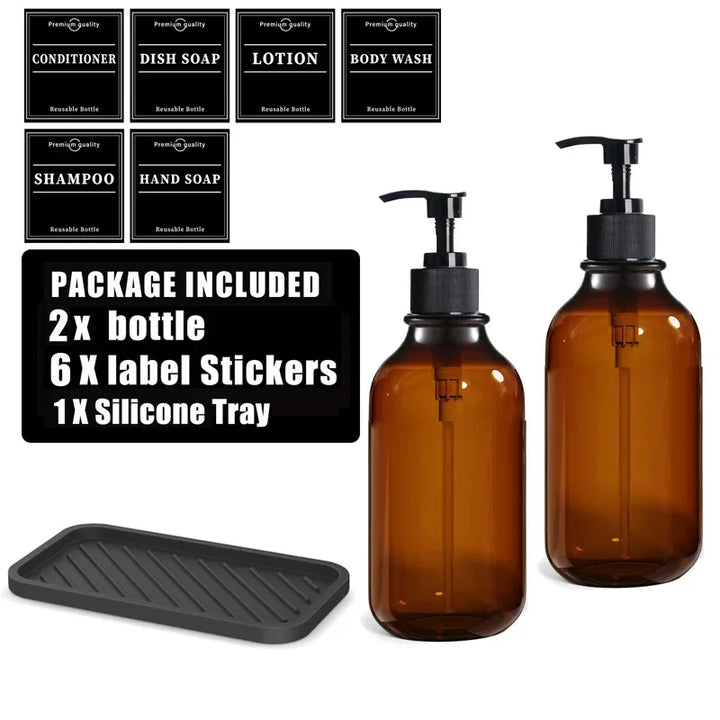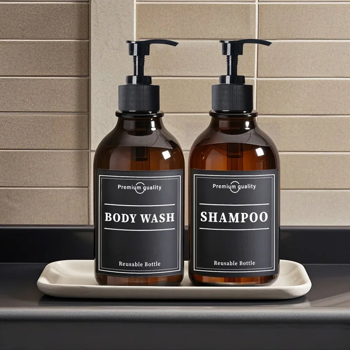 Elegant and practical refillable soap dispenser set with clear labels for shampoo, conditioner, lotion, or liquid soap. Available in 1, 2, or 3-bottle sets with a matching tray. Perfect for keeping your kitchen or bathroom neat, stylish, and organized.