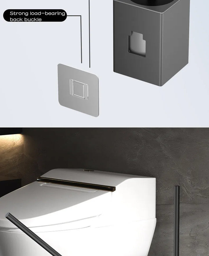 Creative wall-mounted aluminum alloy toilet brush and holder set. Durable, hygienic, and space-saving design keeps your bathroom tidy while providing an elegant, modern look. Ideal for lavatories and home bathrooms.
