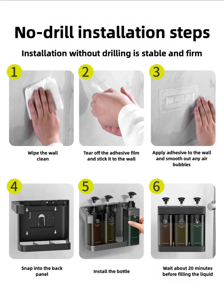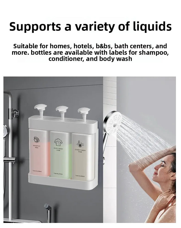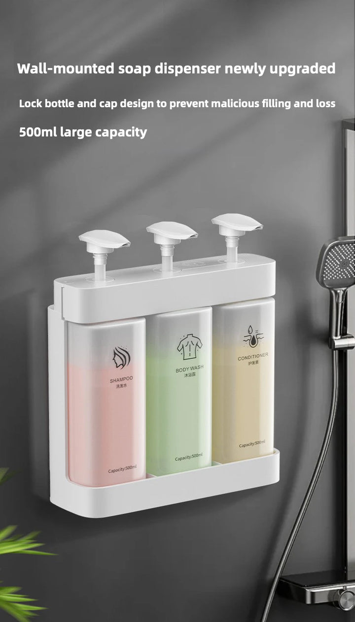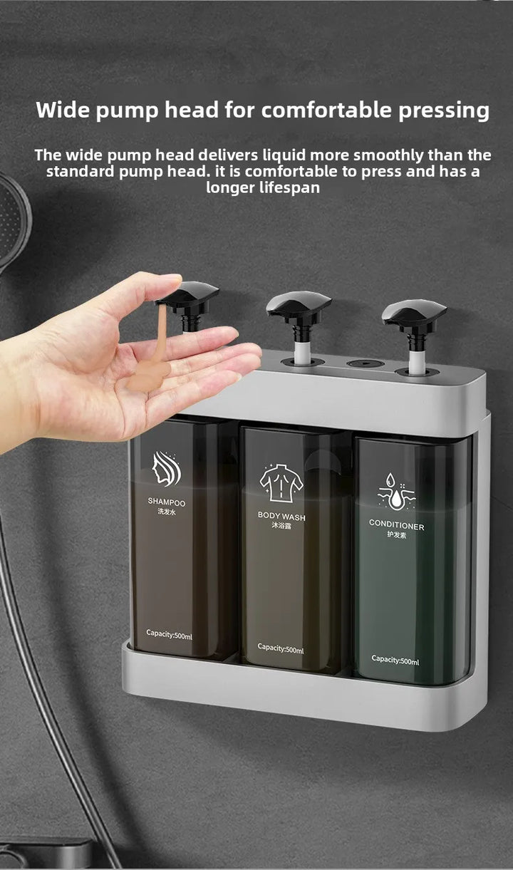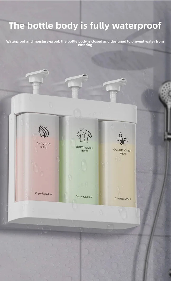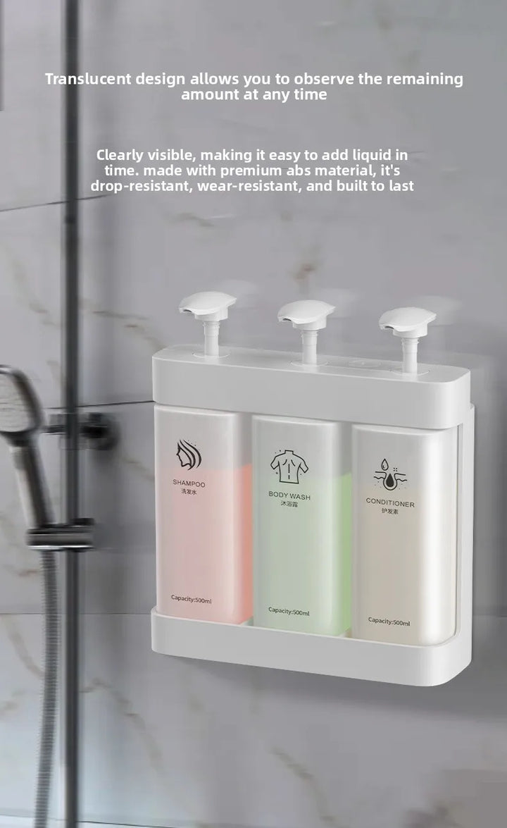 Keep your bathroom neat and modern with this wall-mounted liquid dispensing bottle. Designed with a non-punching installation, it easily mounts without drilling. Perfect for soap, shampoo, body wash, or lotion, the manual press pump ensures smooth and controlled dispensing. Durable, refillable, and space-saving—ideal for bathrooms, kitchens, hotels, and gyms.