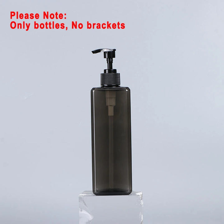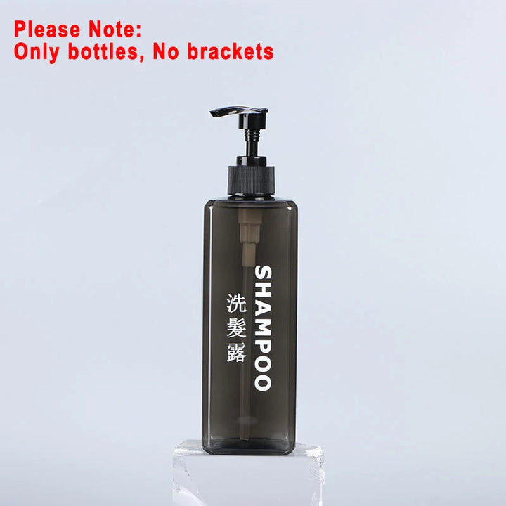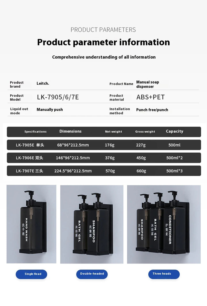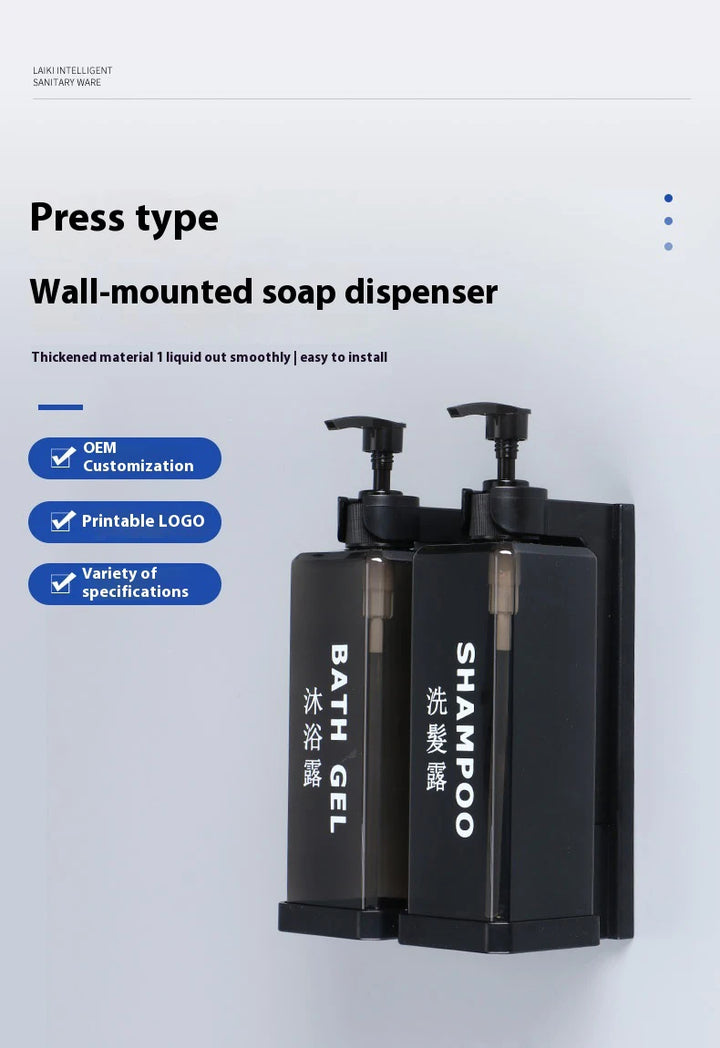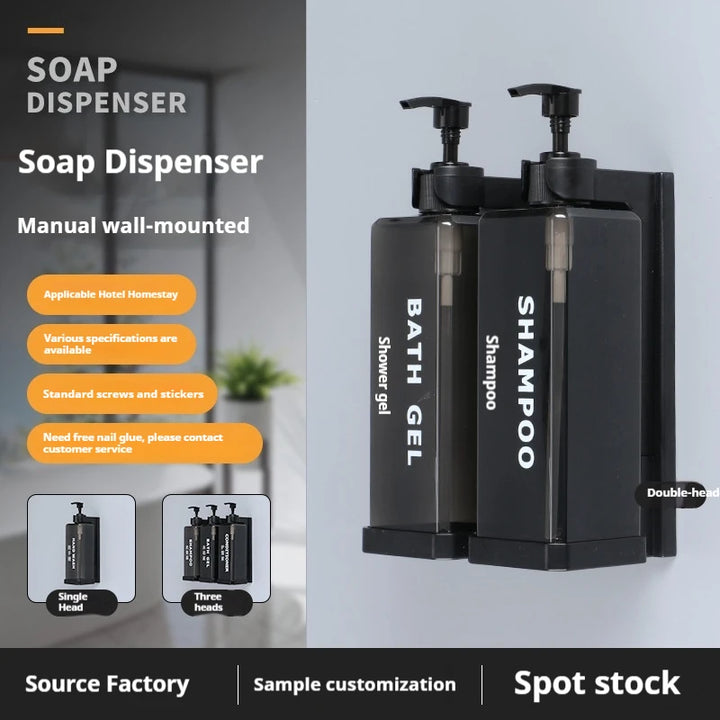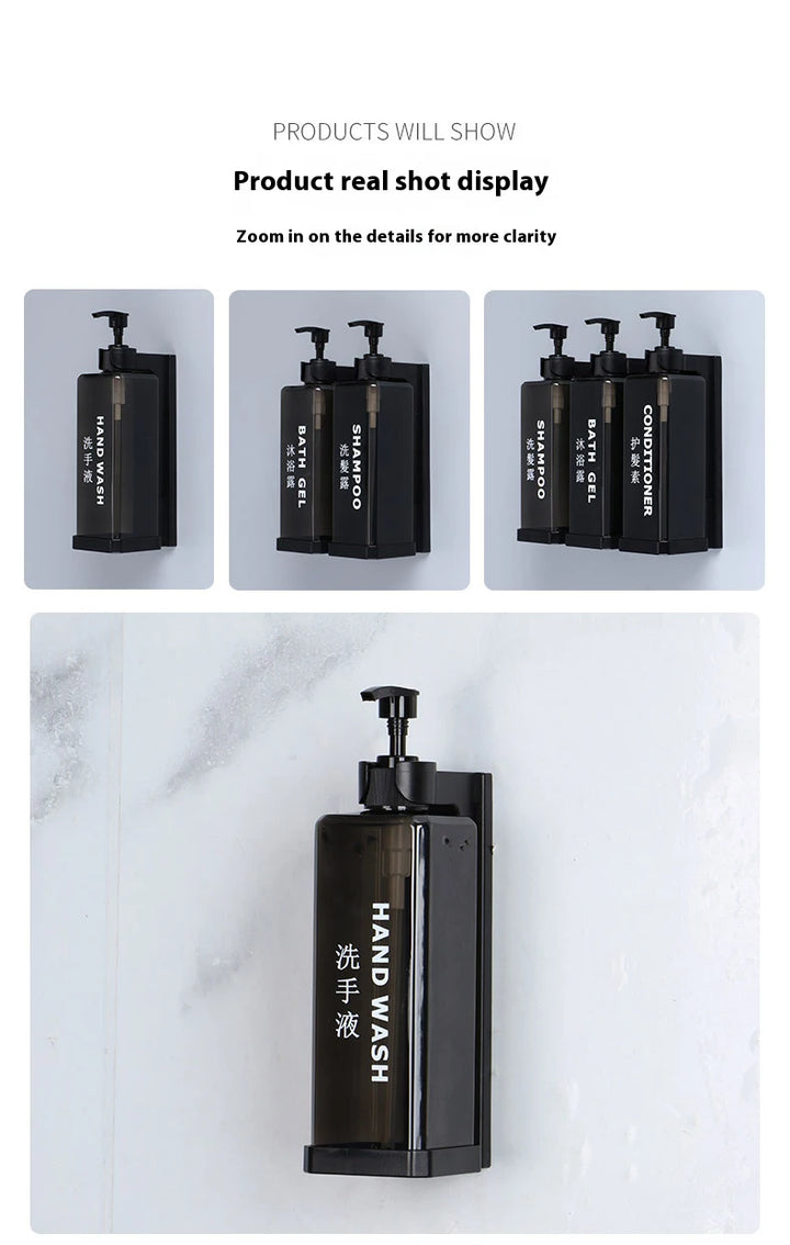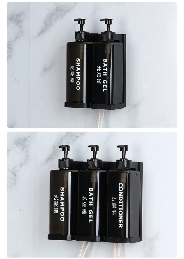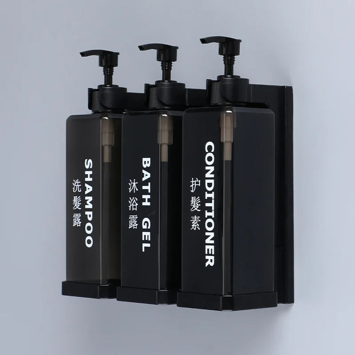 Stylish and practical wall-mounted dispenser set with separate 500ml bottles for shampoo, conditioner, shower gel, or sanitizer. Features a manual press design for easy use, a clean hotel-inspired look, and simple wall installation without drilling.