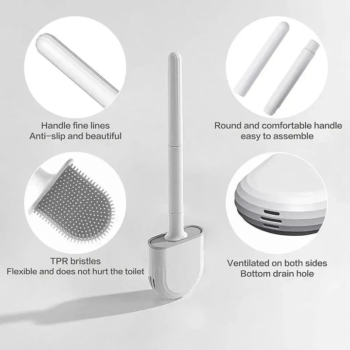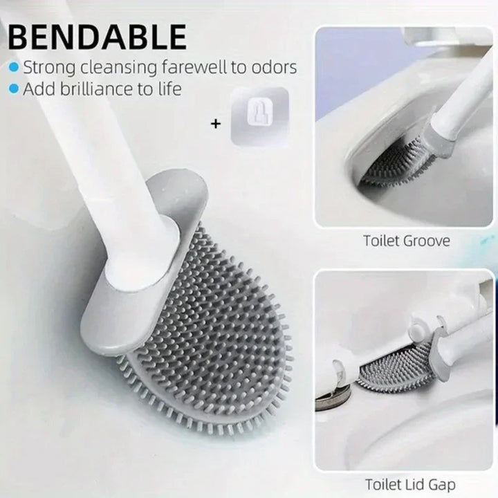 Wall-mounted silicone toilet brush with long handle for toilets and bidets. Soft, quick-drying bristles ensure hygienic and effective cleaning. Durable and space-saving design keeps your bathroom organized and sanitary.