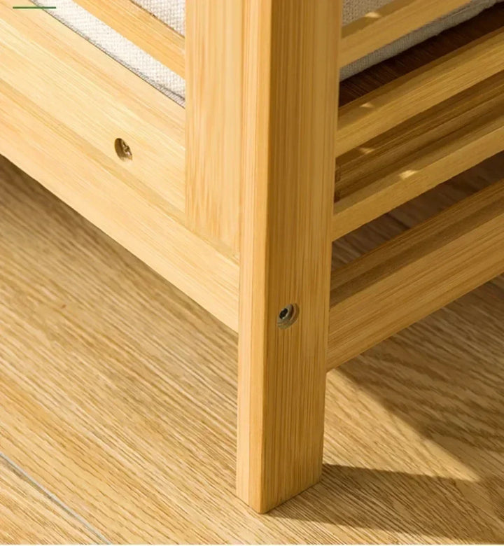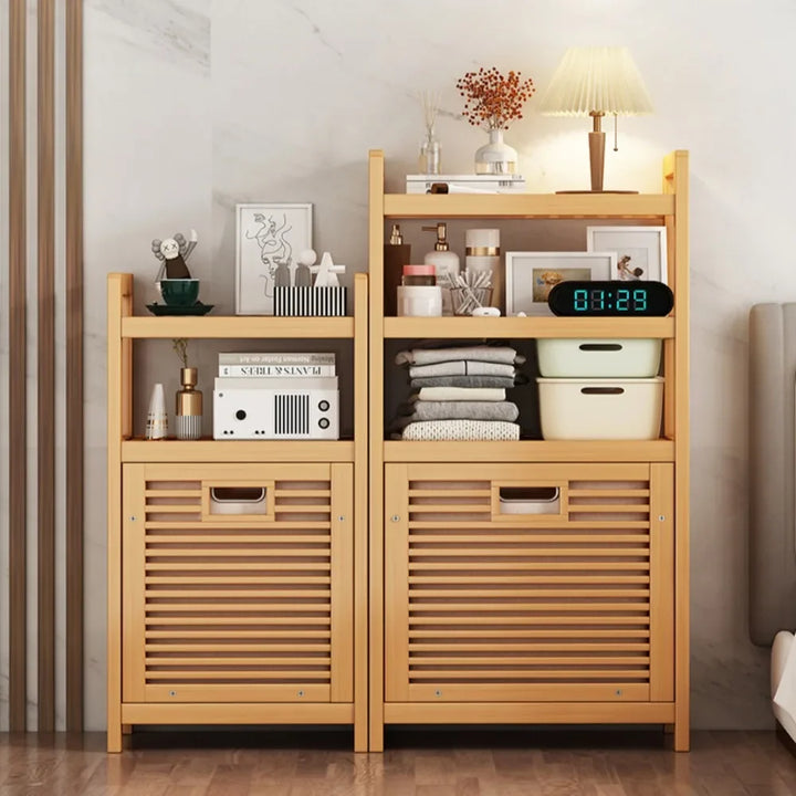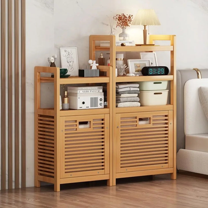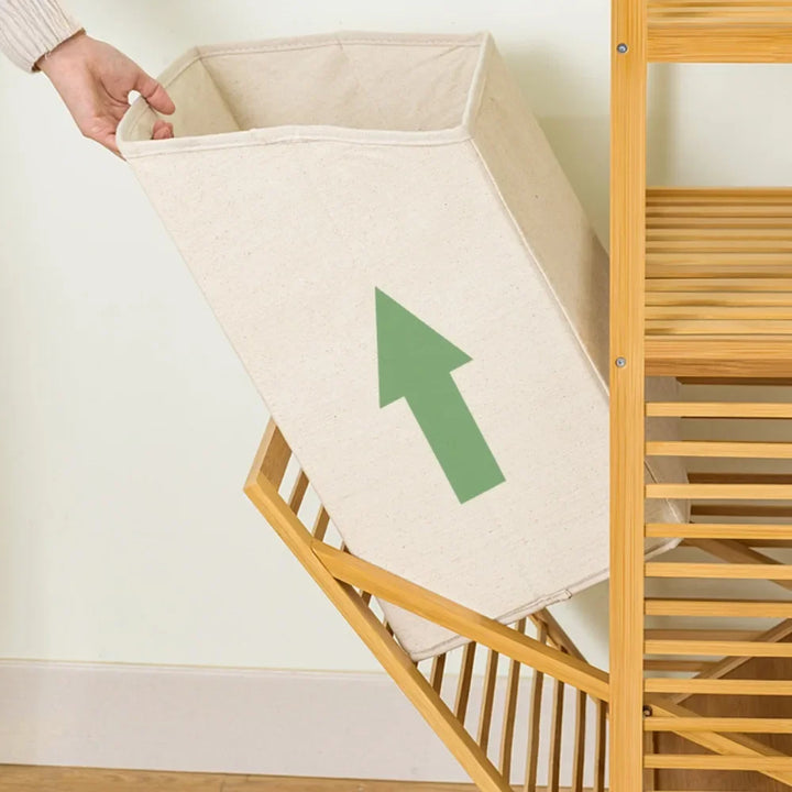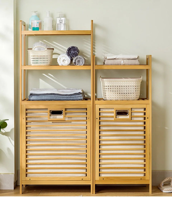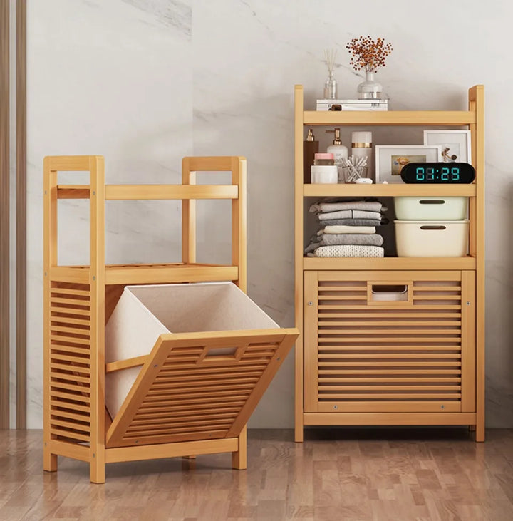 High-capacity bamboo laundry hamper with tilt-out basket and additional shelf. Ideal for bathrooms or laundry rooms, providing organized storage for clothes, towels, and household items. Durable, eco-friendly, and stylish.