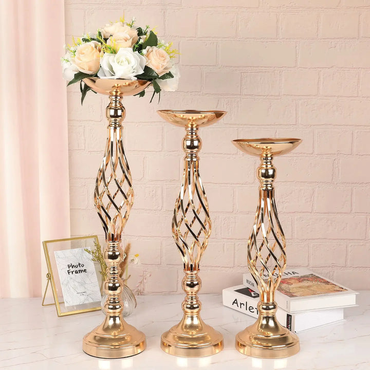 Golden iron art vase-style candlestick with a twisted road design. Perfect as a wedding prop, flower arrangement stand, or elegant table centerpiece.