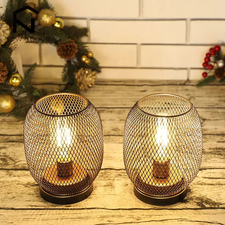 Set of 2 round-shaped metal cage table lamps with LED lighting. Battery-powered and cordless, ideal for weddings, parties, or elegant home décor.