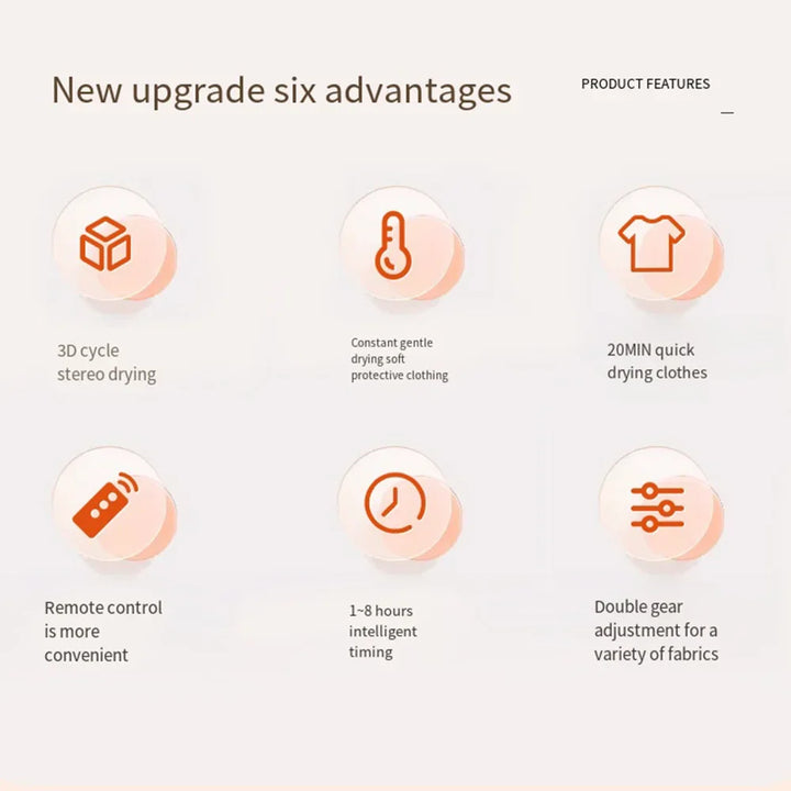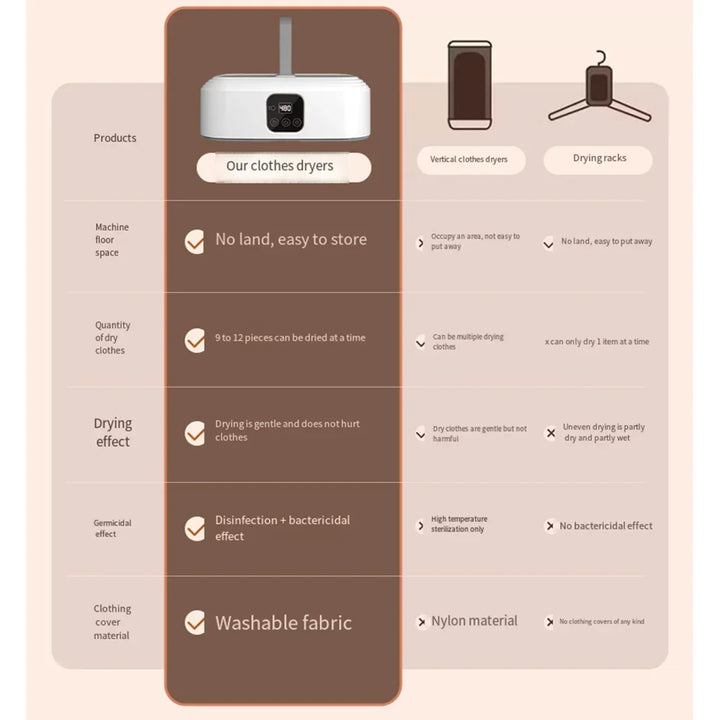 Compact and portable electric clothes dryer perfect for apartments, travel, and RVs. Features a foldable design with a dryer bag for easy storage. Efficient, lightweight, and ideal for quick drying of clothes anytime, anywhere.