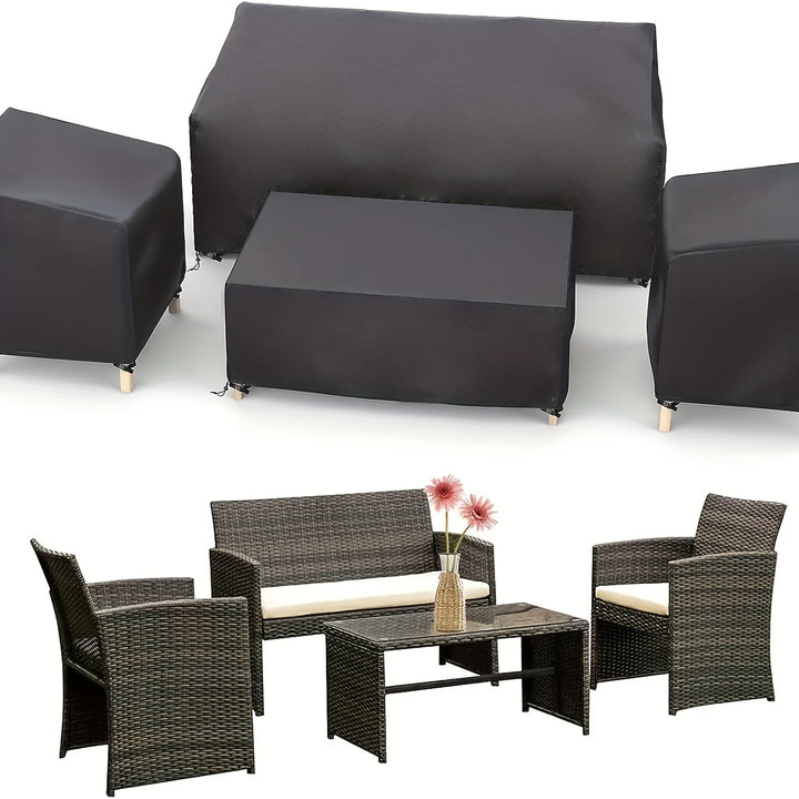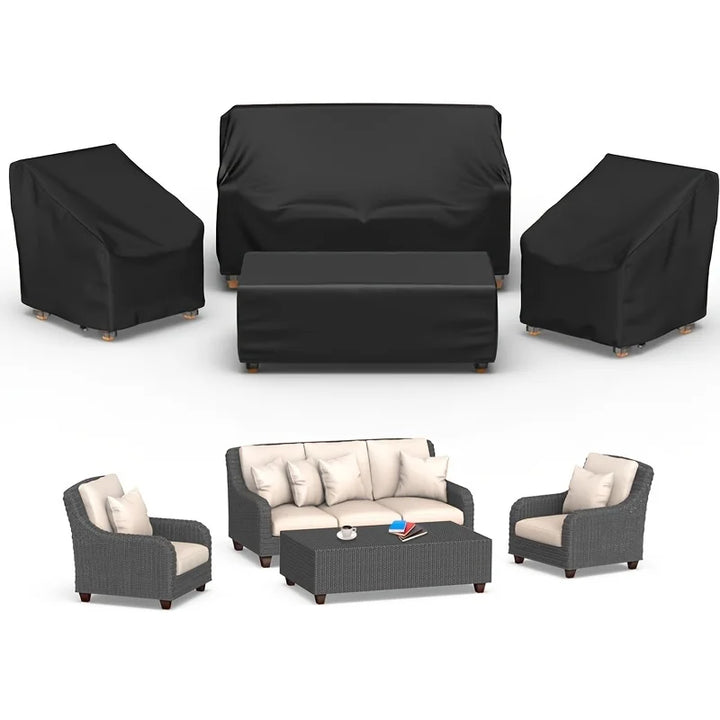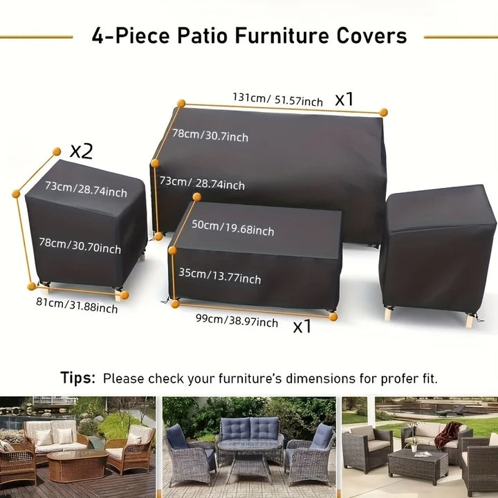 High-quality 420D Oxford waterproof furniture cover set for 4-piece patio conversation sets. Protects against rain, dust, sun, and snow. Durable, tear-resistant, and easy to clean—perfect for year-round outdoor furniture protection.