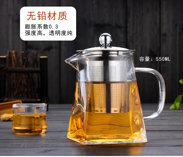 "Durable heat-resistant glass teapot with stainless steel infuser. Perfect for brewing tea or coffee, featuring a clear design and square filter basket for easy brewing."