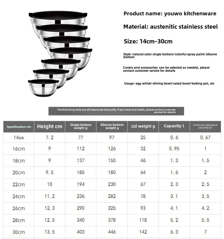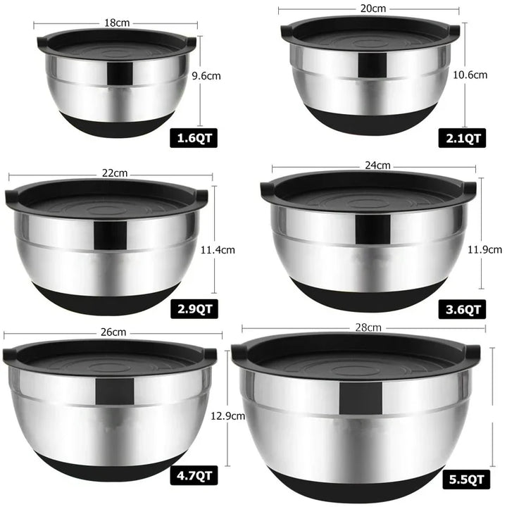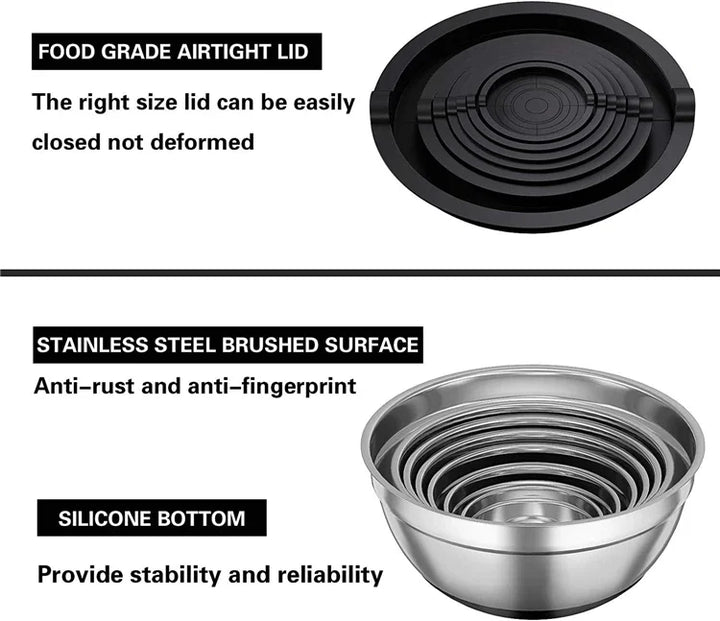 Upgrade your kitchen with this Stainless Steel Mixing Bowls Set, featuring non-slip bases for stability and tight-fitting lids for convenient storage. Perfect for baking, meal prep, salad mixing, or ingredient storage, these bowls nest for space-saving organization. Crafted from high-quality stainless steel, they are durable, easy to clean, and rust-resistant, making them ideal for everyday use. The combination of practical design and modern style ensures your kitchen stays organized and functional.