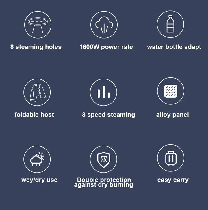 Powerful 1600W foldable handheld garment steamer for quick and efficient wrinkle removal. Features 3-speed steam control, dual voltage (110V–240V), and a compact design ideal for travel or home use. Fast heating and easy to store.