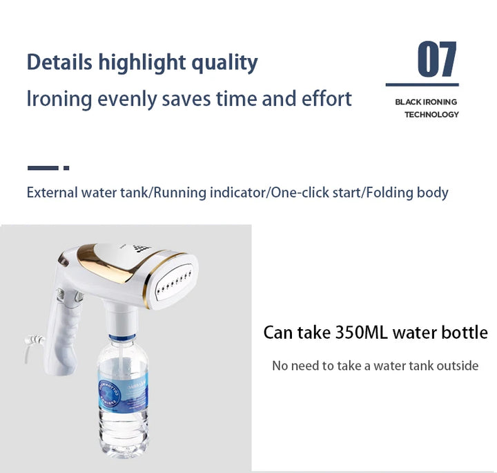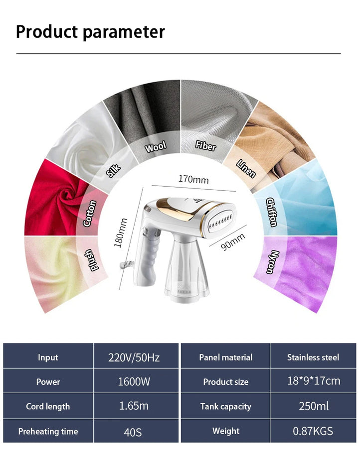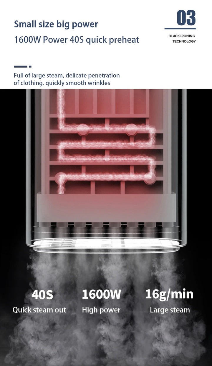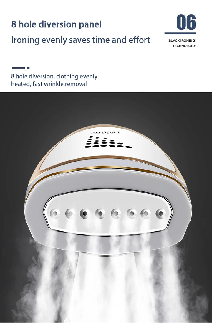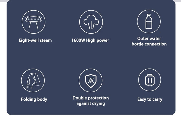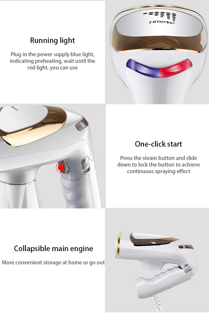 Compact 1600W folding and hanging steam iron with adjustable temperature control. Ideal for household and travel use—lightweight, fast-heating, and easy to store. Perfect for quick wrinkle removal on clothes and fabrics.