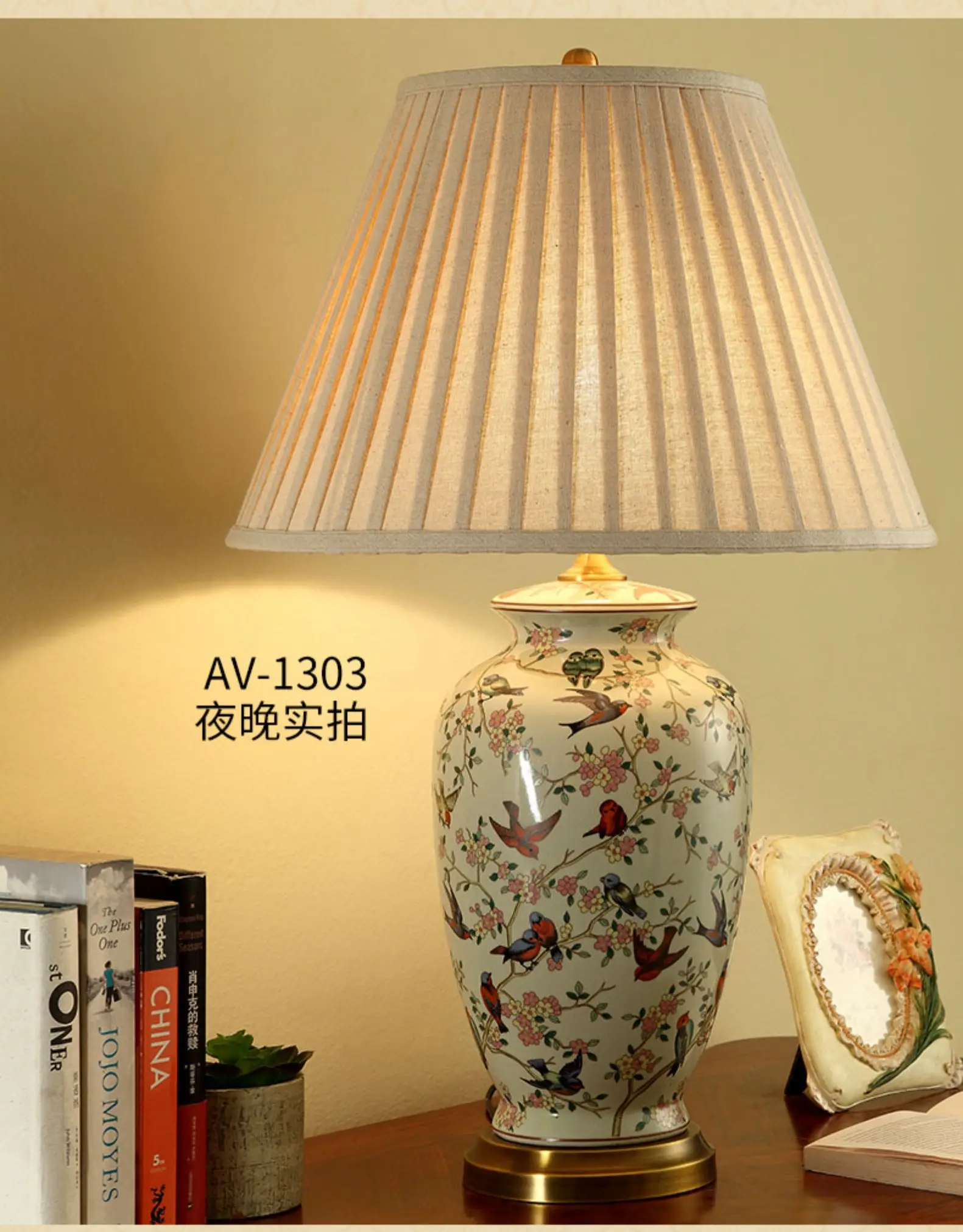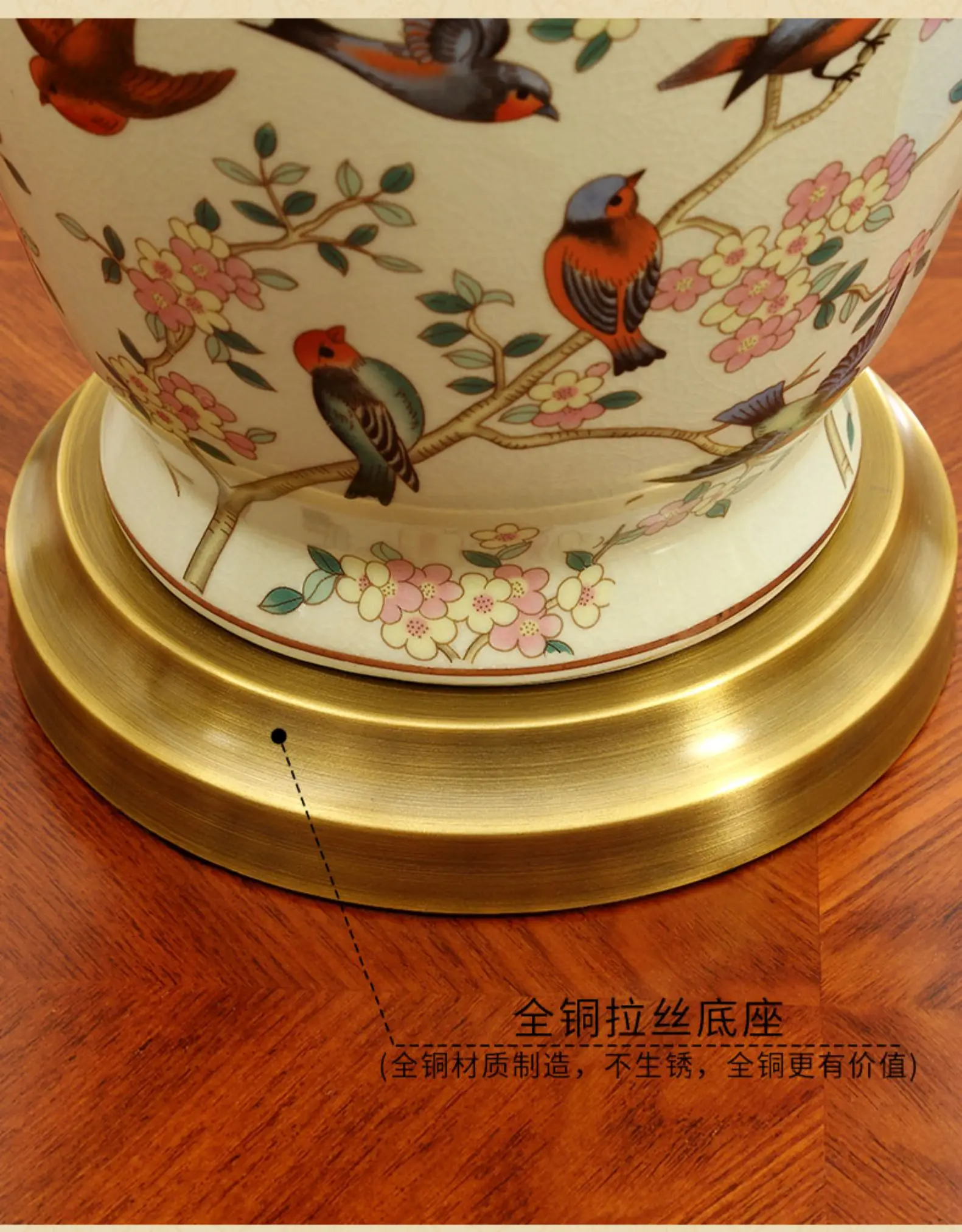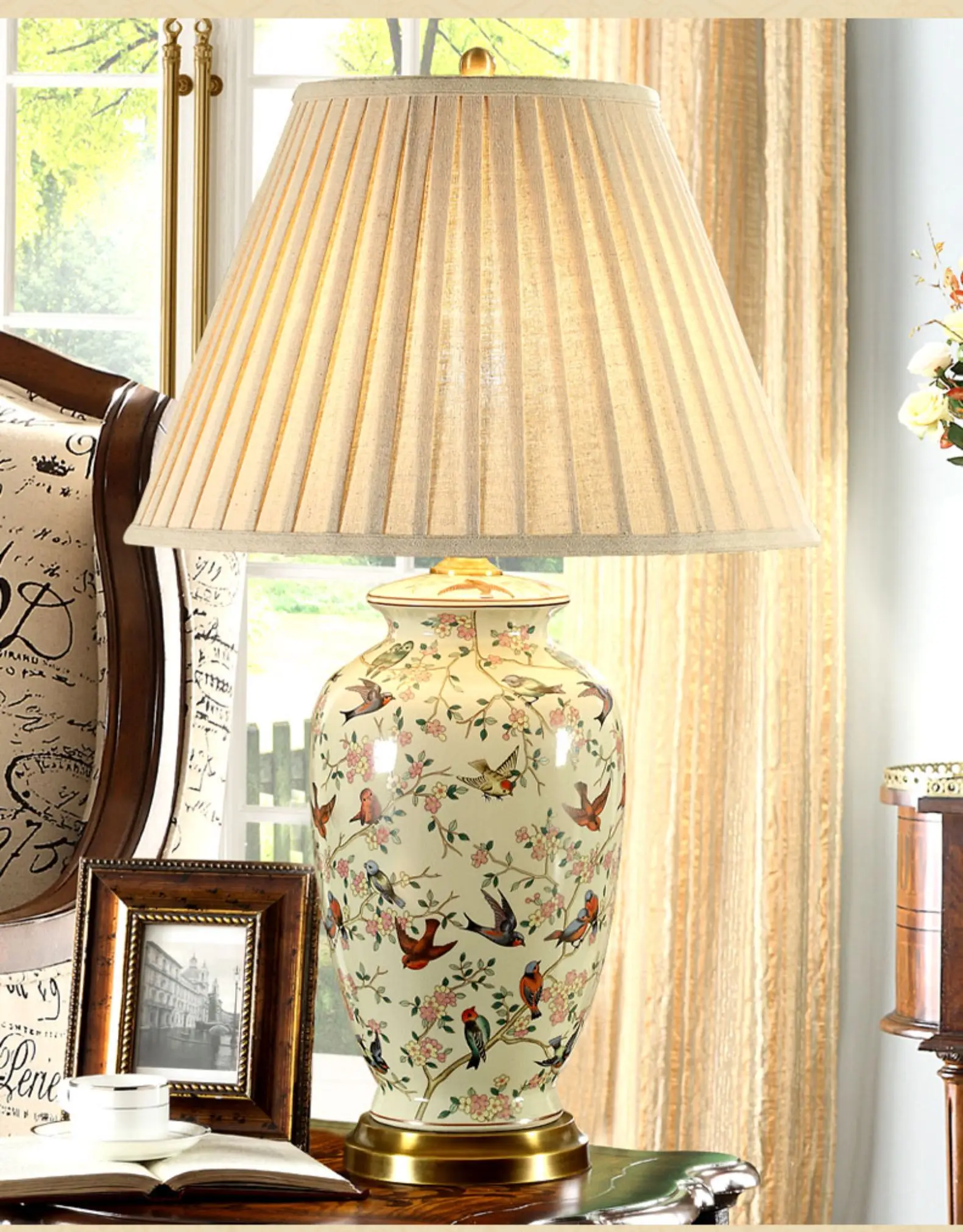 American retro-style ceramic table lamp with flower and bird design. Ideal for bedside, bedroom, study, or hotel décor, adding a creative vintage touch.