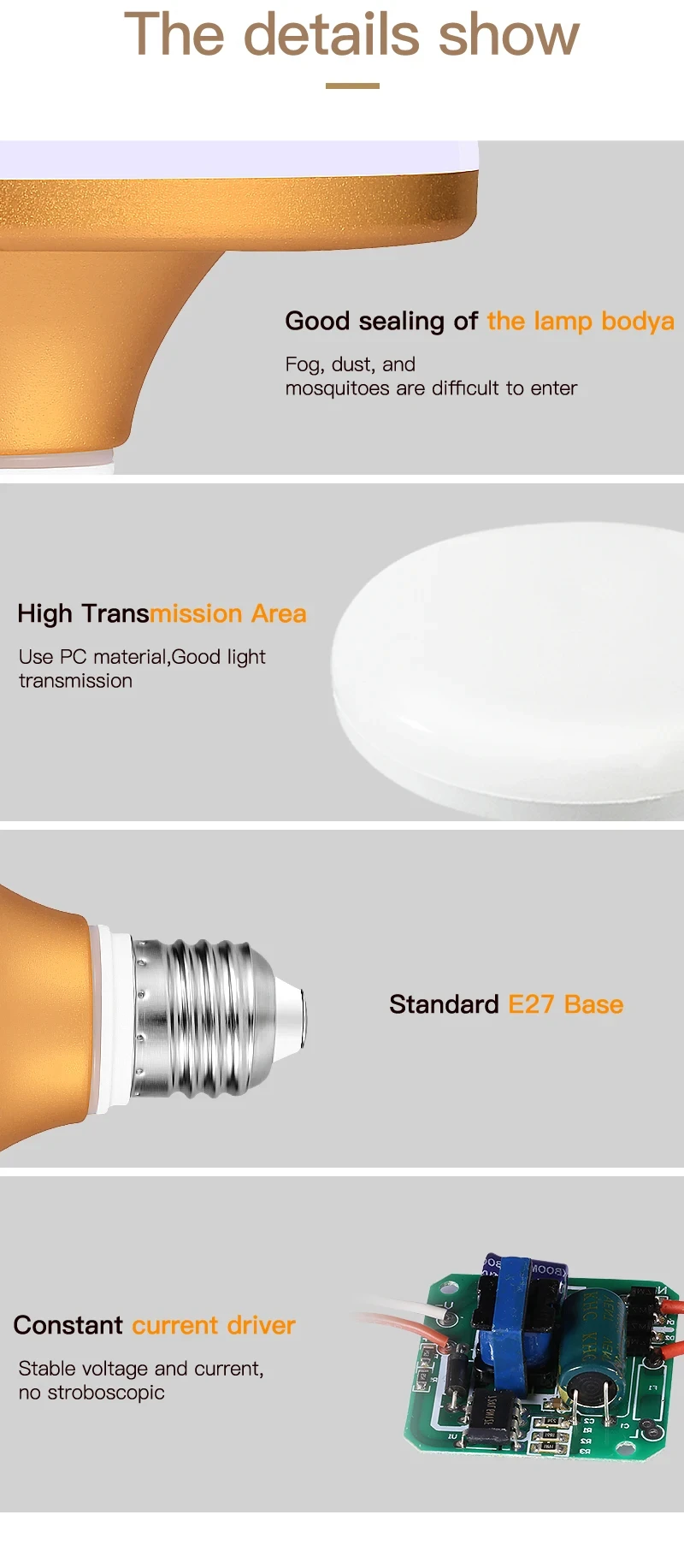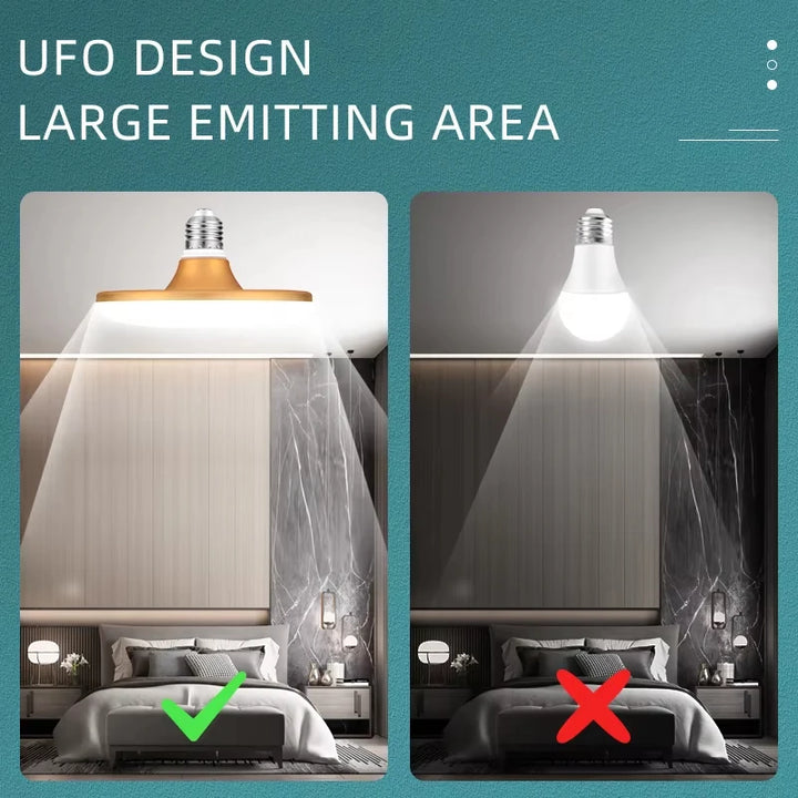Brighten your home or workspace with this E27 UFO LED ceiling light bulb. Available in 20W, 50W, and 60W, it provides energy-efficient, long-lasting illumination for indoor spaces such as garages, living rooms, bedrooms, and offices. Easy to install, AC220V compatible, and designed for wide-angle lighting, it combines modern style with practicality.