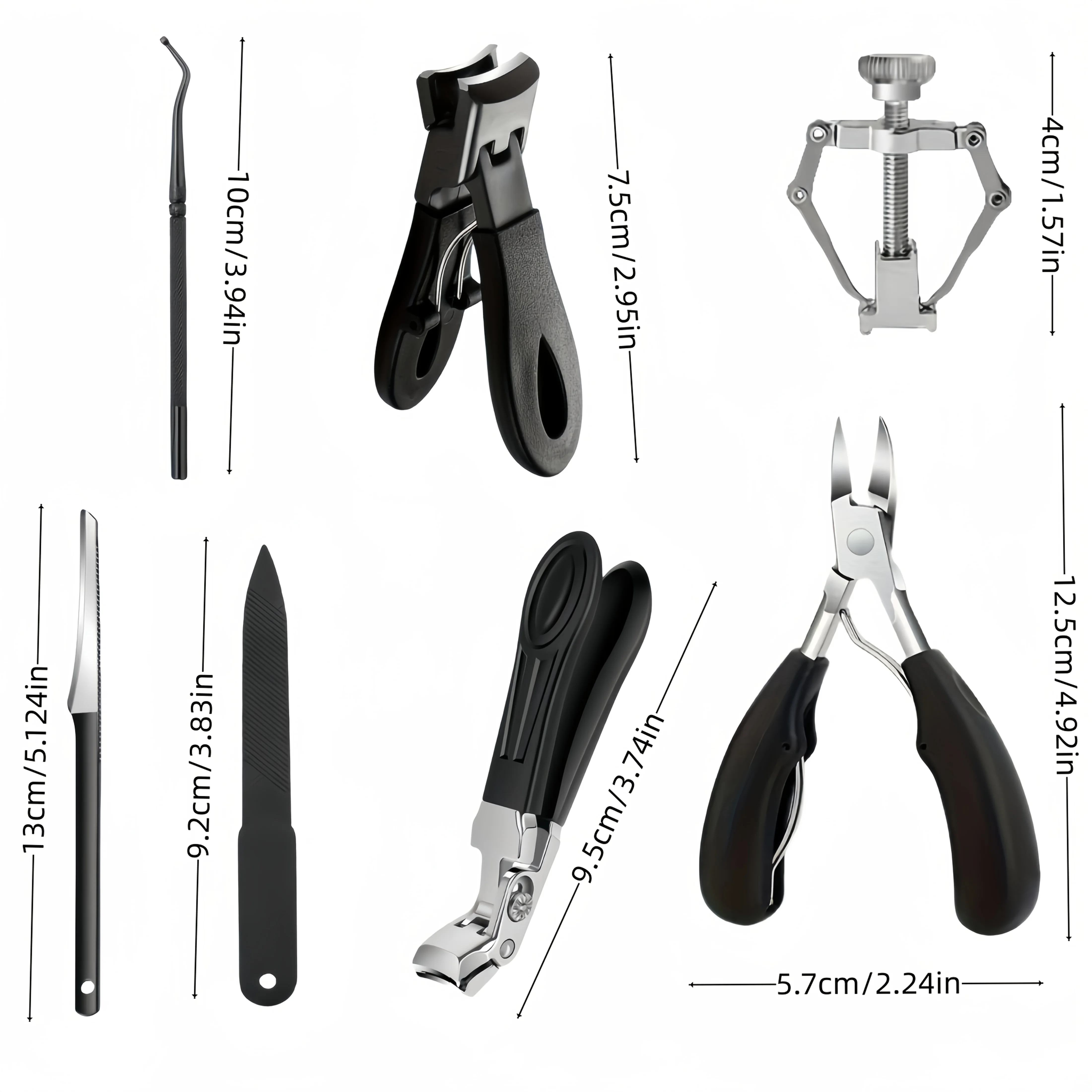 Professional 7-piece nail clipper and manicure tool set with cuticle nippers and cutters, all neatly stored in a portable travel case. Ideal for precise nail care at home or on the go.