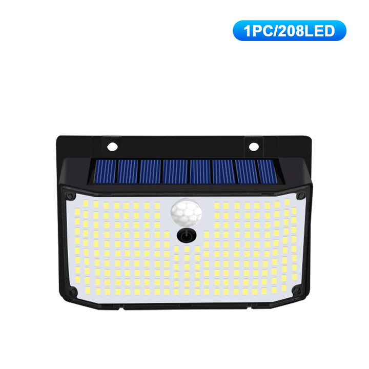 4PCS outdoor solar wall lights with 138 LEDs, motion sensor, 3 lighting modes, IP65 waterproof, powered by solar with built-in lithium battery. Perfect for garden, yard, street, and holiday decoration.