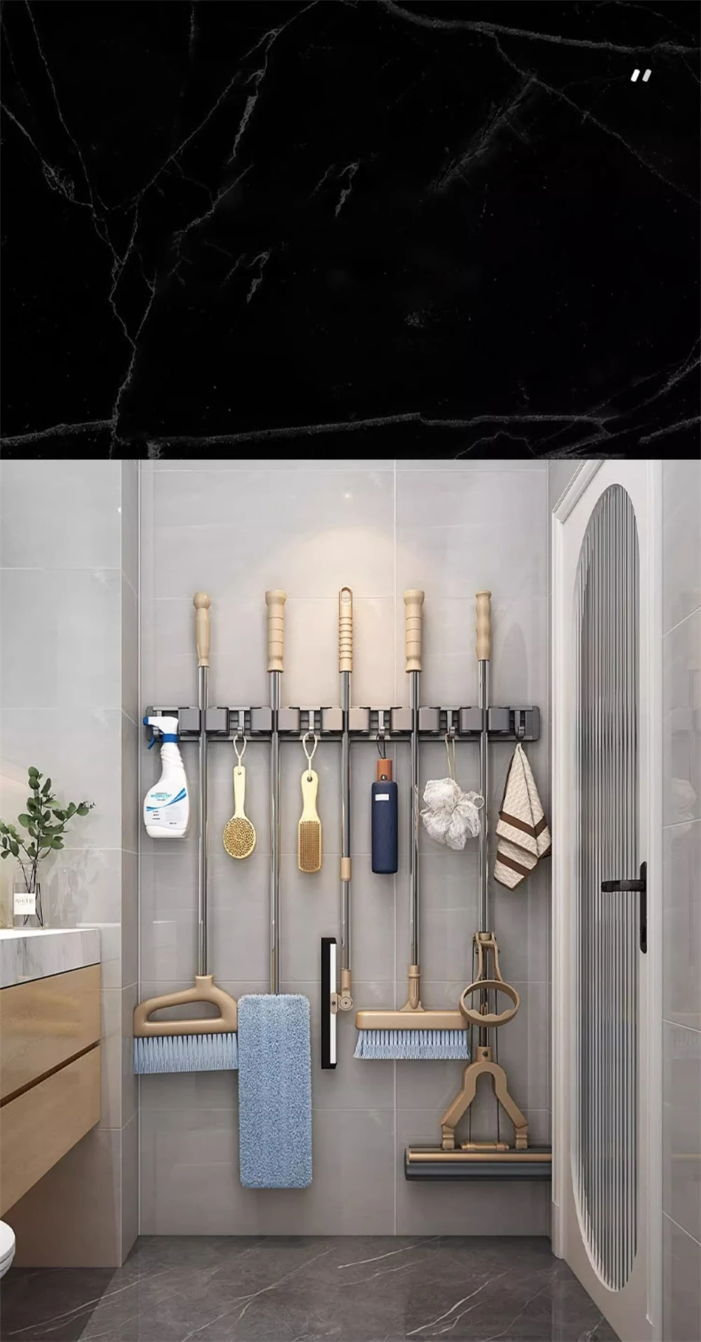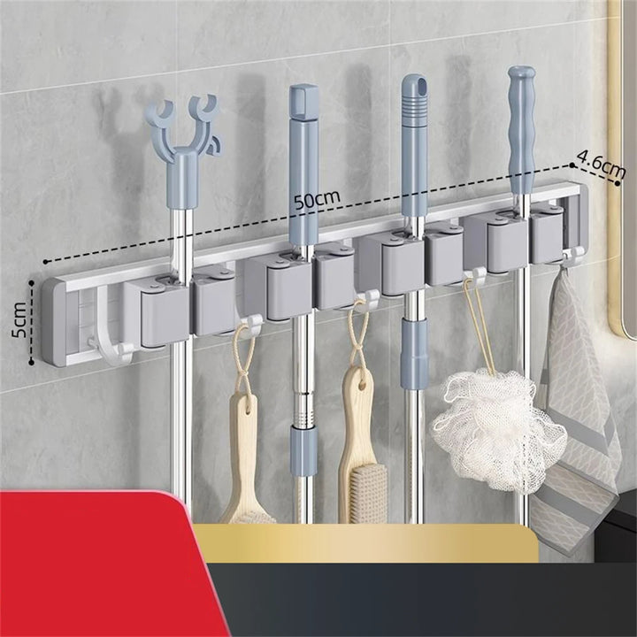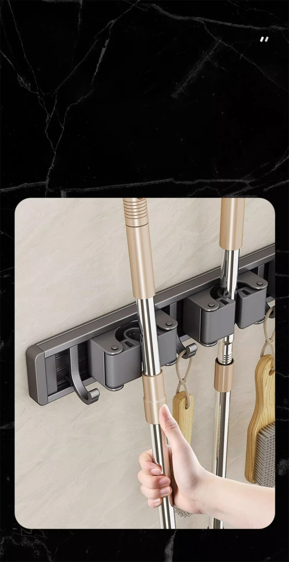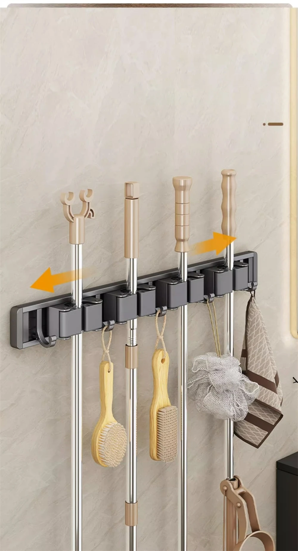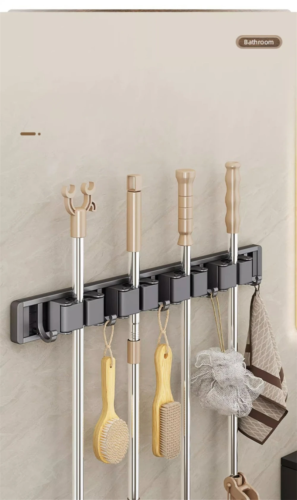 Wall-mounted mop and broom clip rack for easy storage of cleaning tools. Ideal for toilets, kitchens, and home spaces, keeping mops, brooms, and other tools organized and accessible.