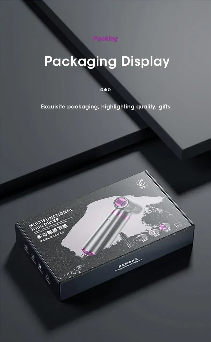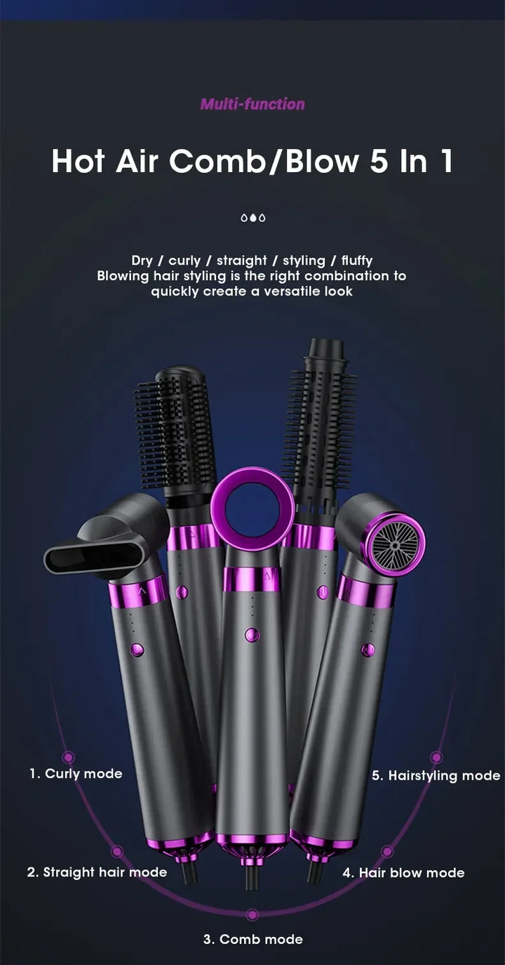 Achieve salon-quality hair at home with this 5-in-1 multifunctional hair styling set. Features a powerful blow dryer, straightener, and curler with negative ion technology for smooth, frizz-free hair. Strong airflow and versatile attachments make styling quick, easy, and professional.