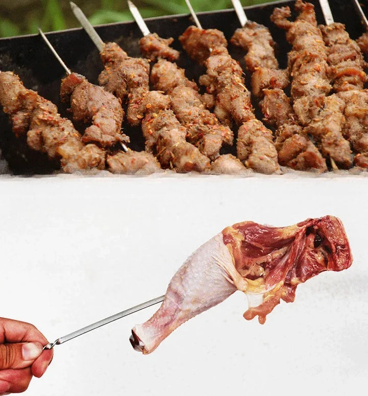 Set of 6 long-handle BBQ skewers with stainless steel rods and wooden handles. Perfect for shish kebabs, grilling meats and vegetables, ideal for outdoor barbecues, picnics, and camping.