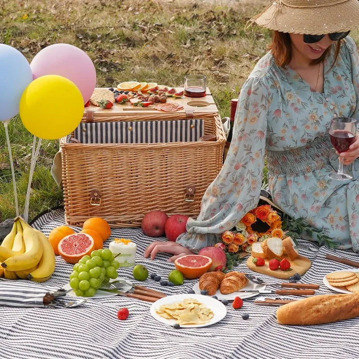 Elegant wicker picnic basket set for four with blanket and bamboo wine table — perfect for outdoor gatherings, camping, and special occasions.