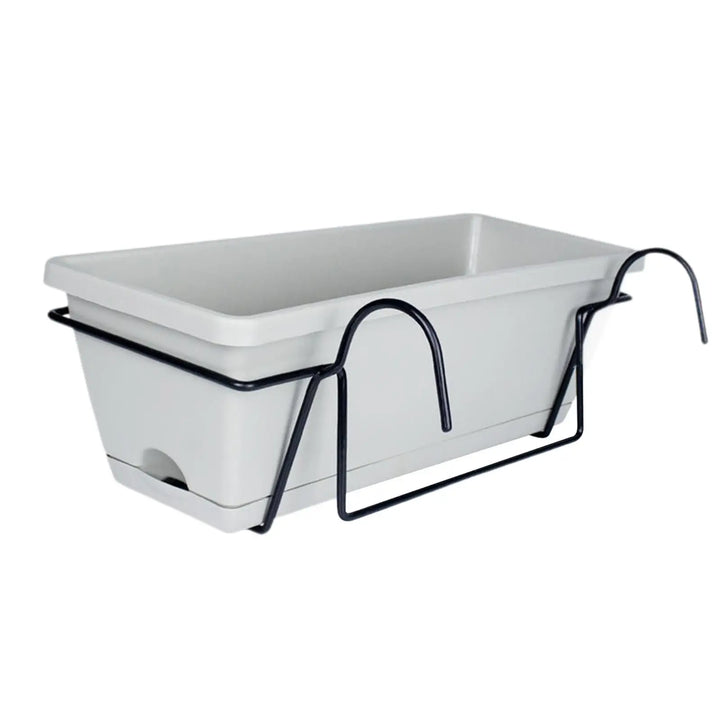 "Durable hanging flower pot for fences and balconies. Features drainage holes and a removable tray, perfect for flowers, herbs, or small plants. Measures 43x19x15 cm."