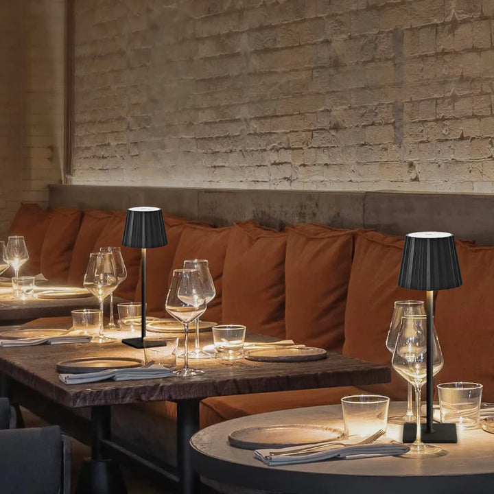 Wireless USB rechargeable LED desk lamp with touch control. Features 3-color stepless dimming for adjustable ambiance lighting on tables or desks.