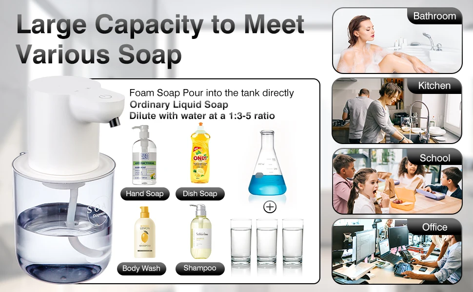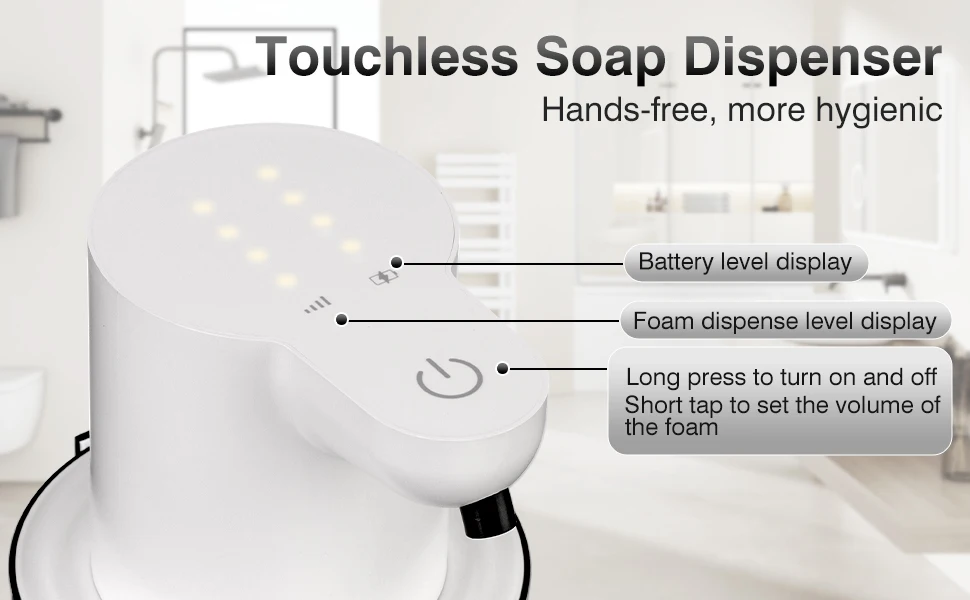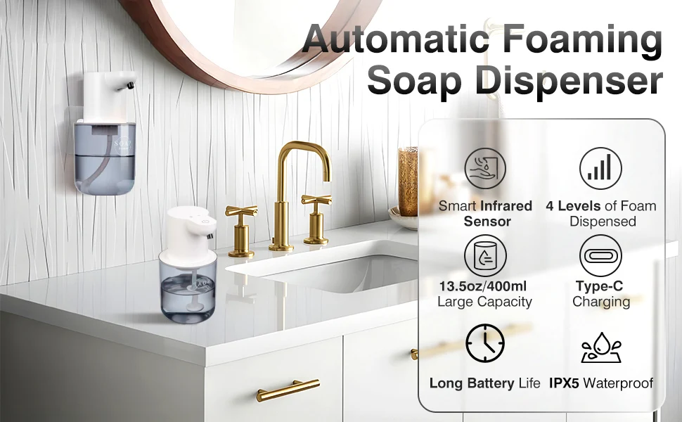A rechargeable, wall-mounted automatic soap dispenser with sensor activation. Perfect for dispensing hand sanitizer, liquid soap, or foam in bathrooms or kitchens, offering a hygienic, touch-free experience.