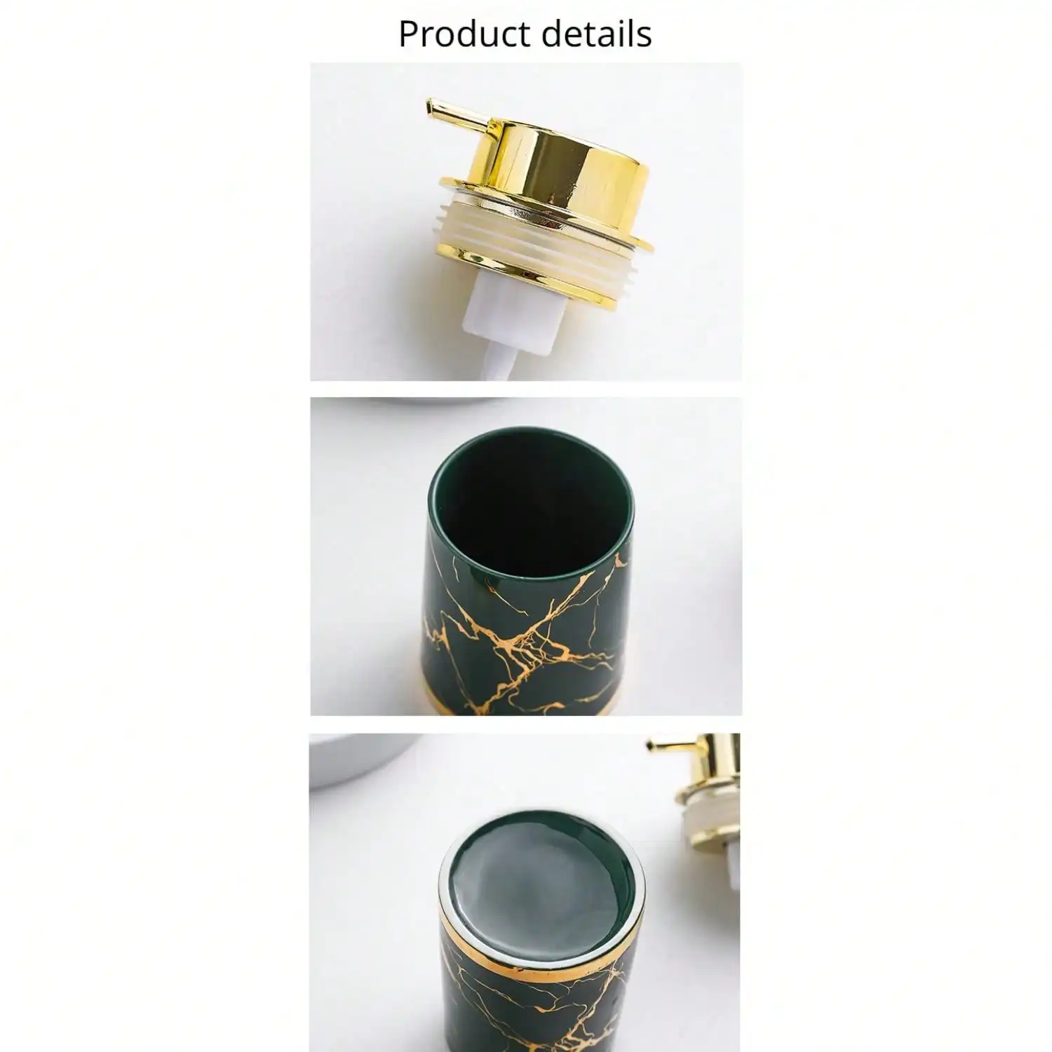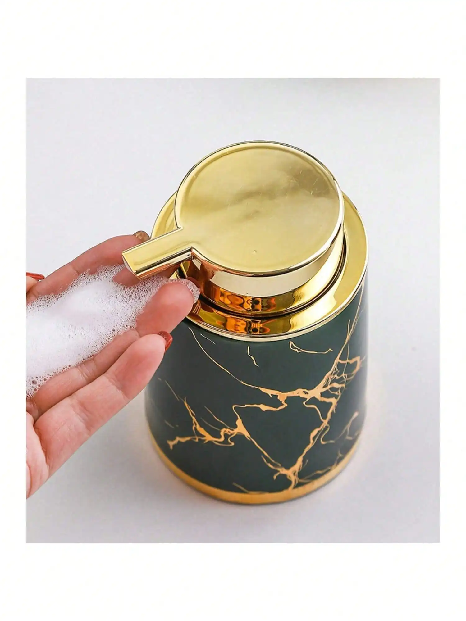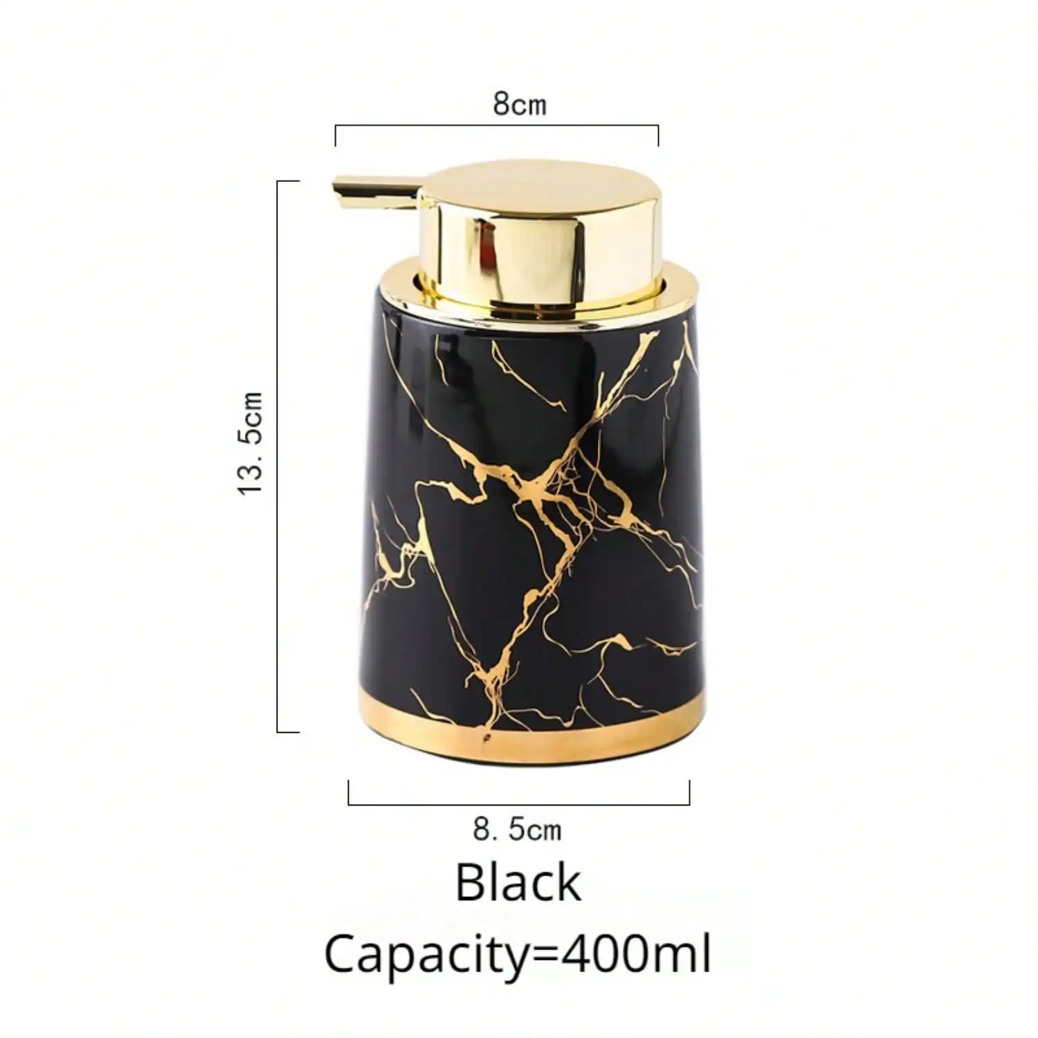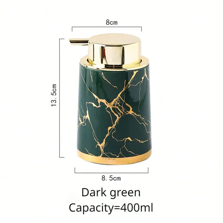 A 400ml luxury ceramic soap dispenser with marble texture, ideal for mousse or foaming soap, facial cleansers, and other liquids. Refillable and stylish, perfect for bathroom countertops.