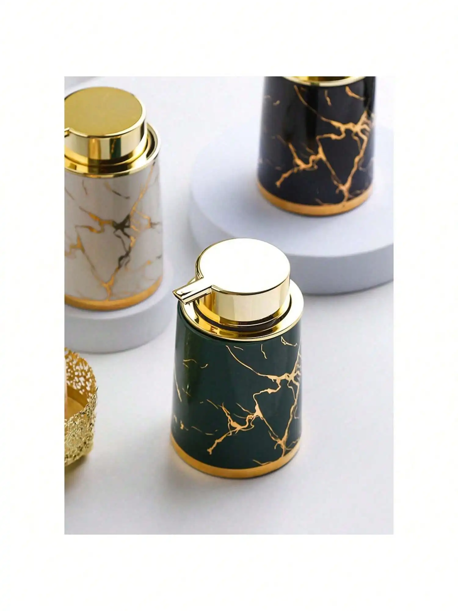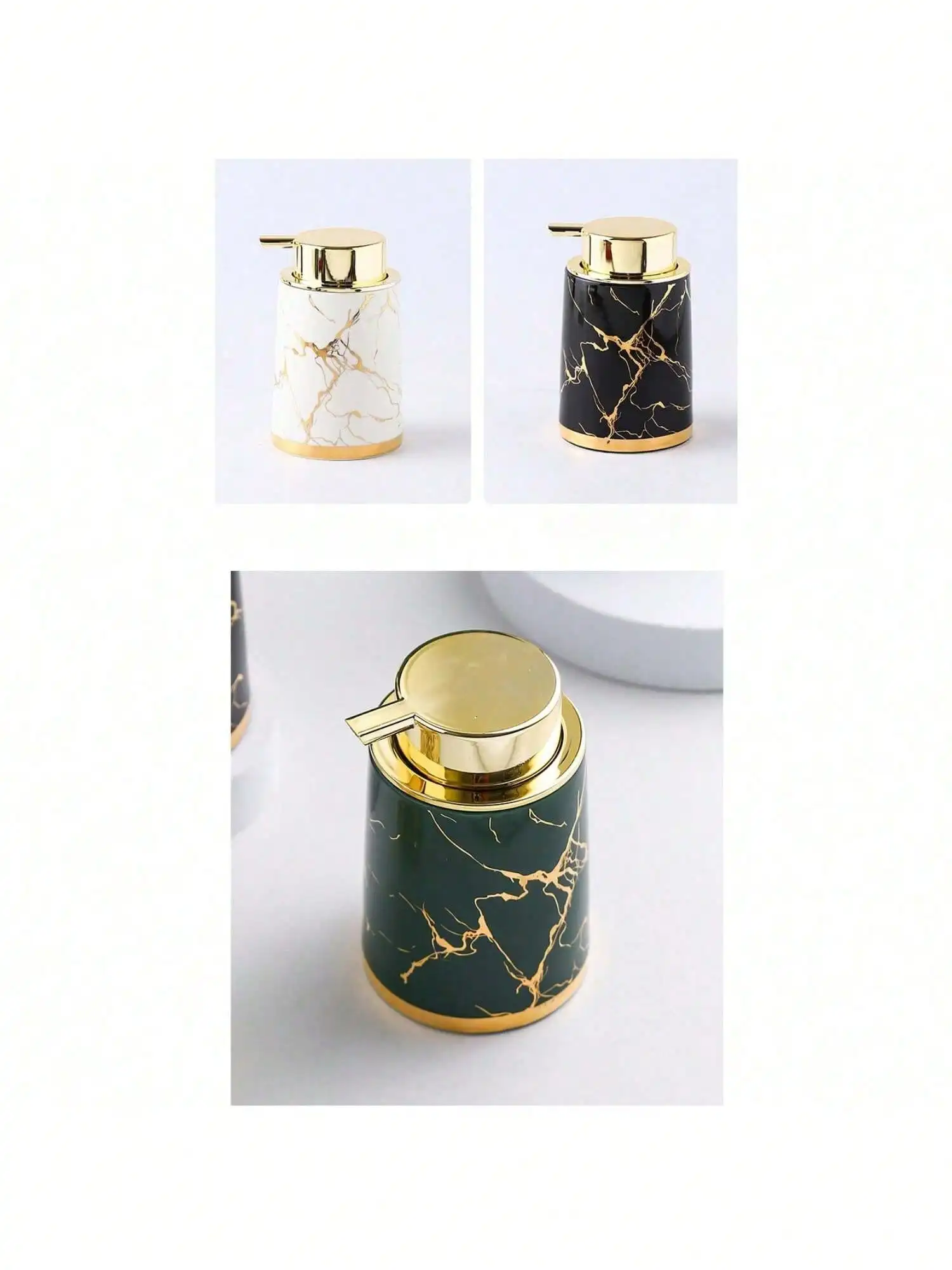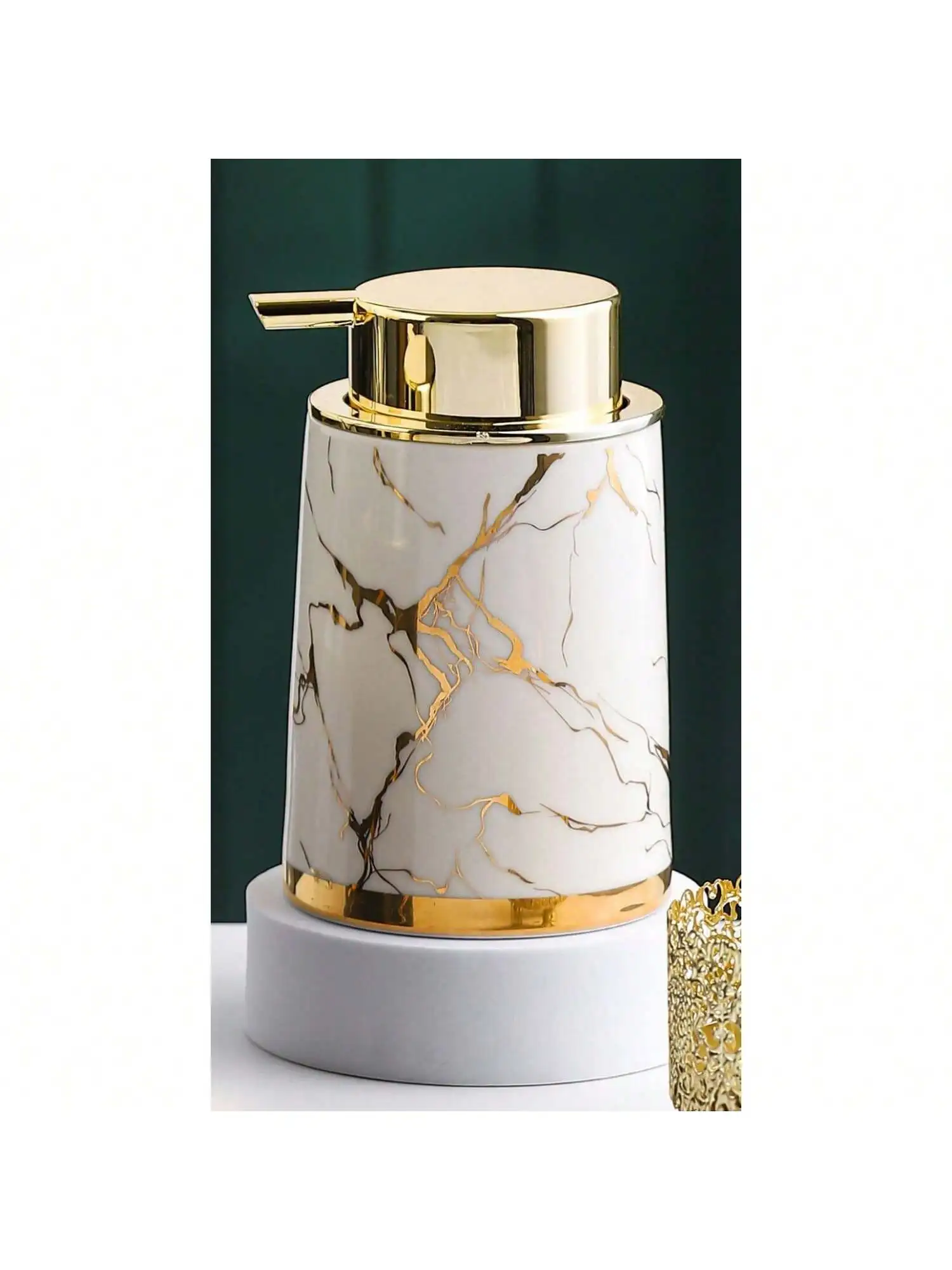 A 400ml luxury ceramic soap dispenser with marble texture, ideal for mousse or foaming soap, facial cleansers, and other liquids. Refillable and stylish, perfect for bathroom countertops.