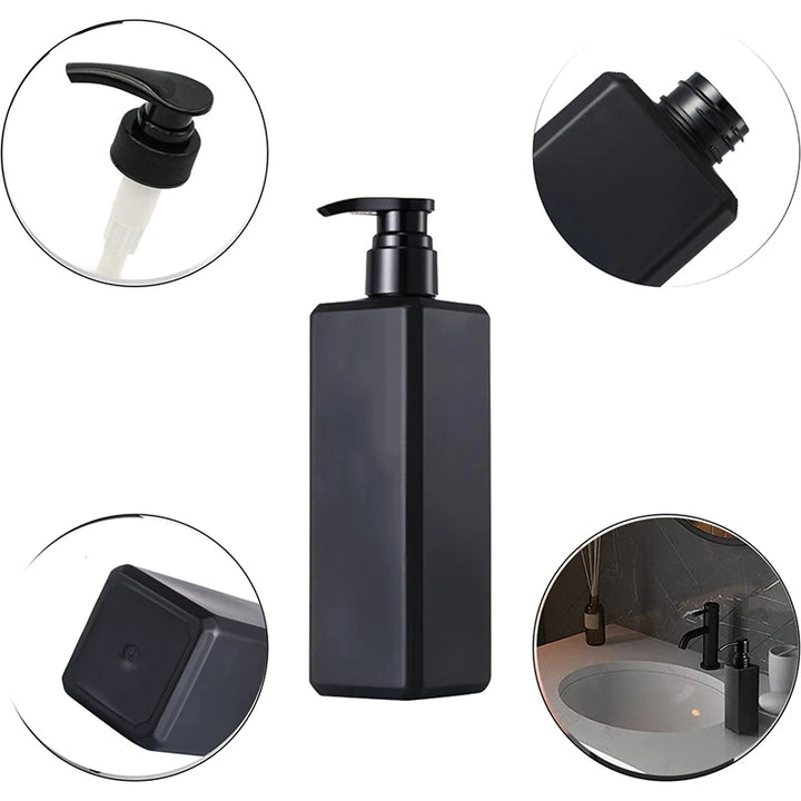 A set of 1, 2, or 4 refillable 500ml plastic soap dispensers with black pump. Ideal for liquid soap, shampoo, conditioner, or body wash, perfect for home or bathroom use.