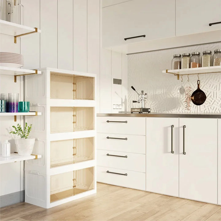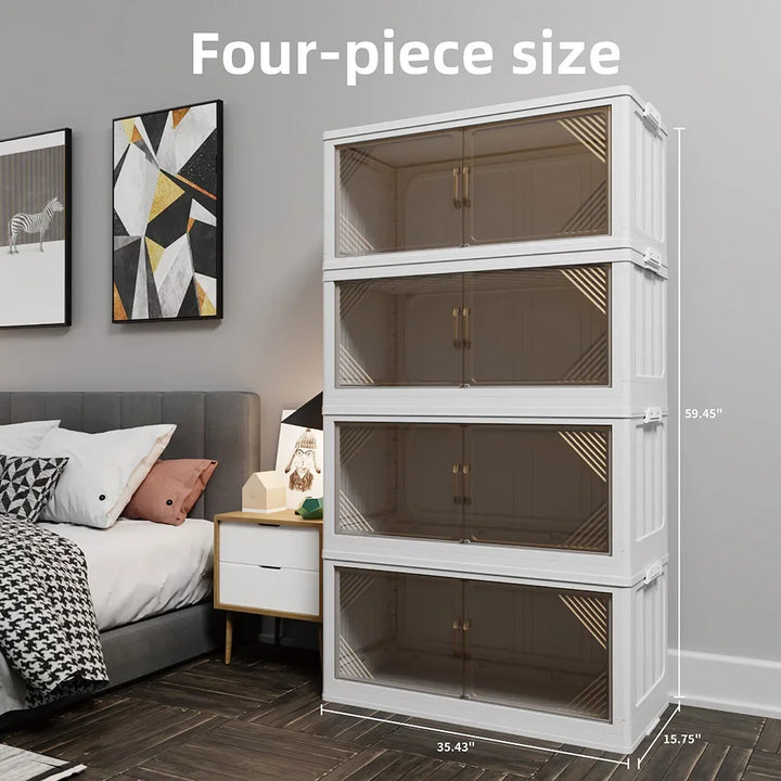 Keep your closet neat with this 4-pack of wide transparent plastic storage cabinets. Foldable and stackable design for versatile and space-saving organization.