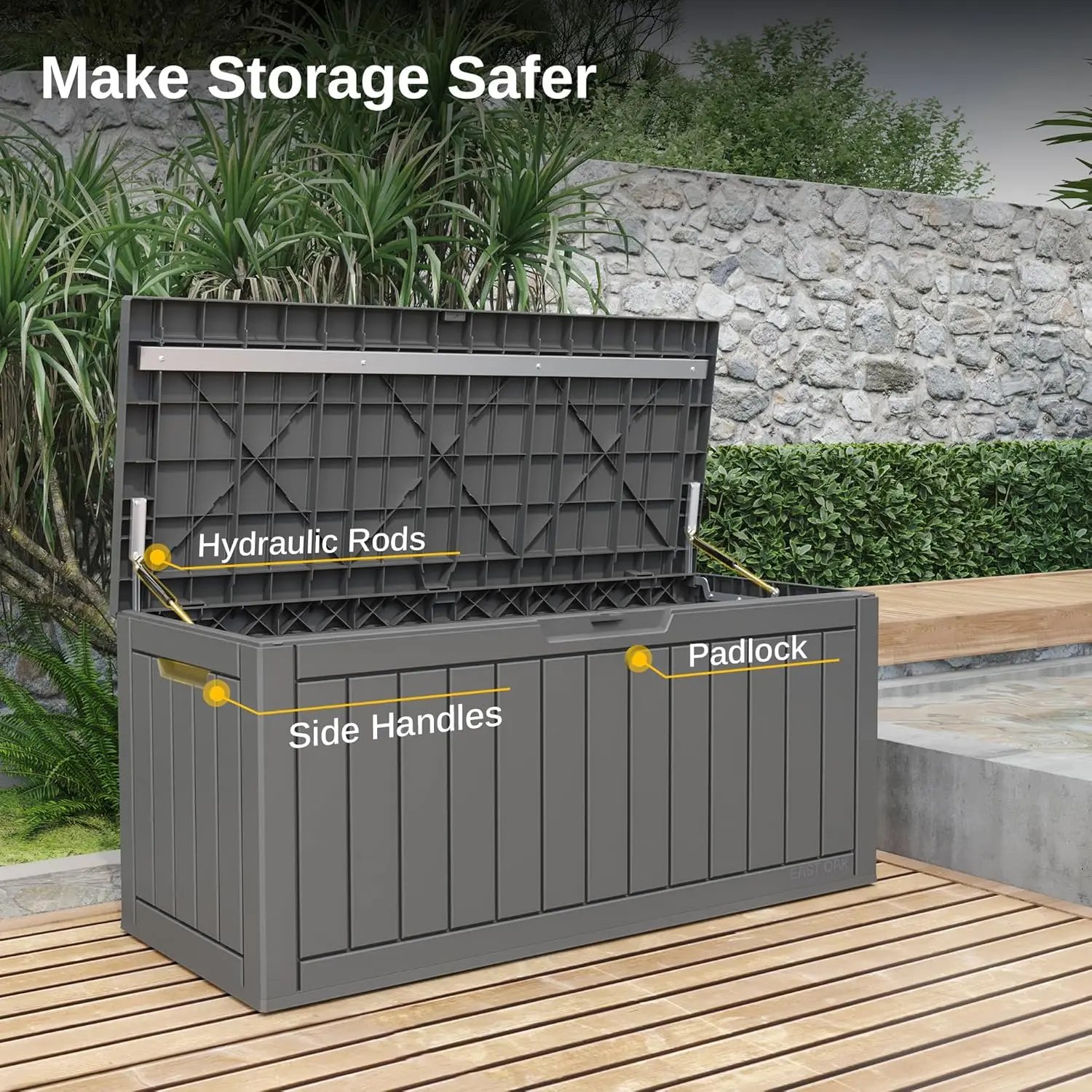 A large 90-gallon waterproof resin storage box designed for outdoor use. Perfect for storing patio cushions, gardening tools, and outdoor accessories. Features a lockable lid for added security and a sleek grey finish.