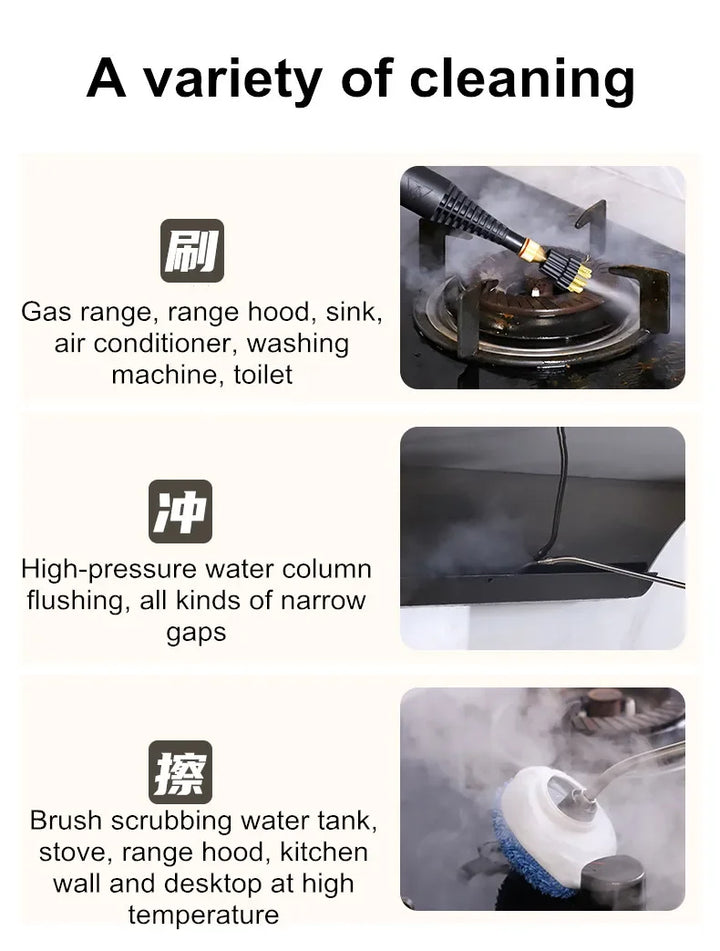 Equipped with a brush head, it efficiently removes oil stains, dirt, and bacteria from kitchens, bathrooms, and air conditioners.