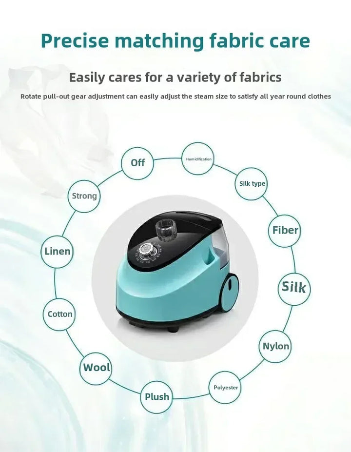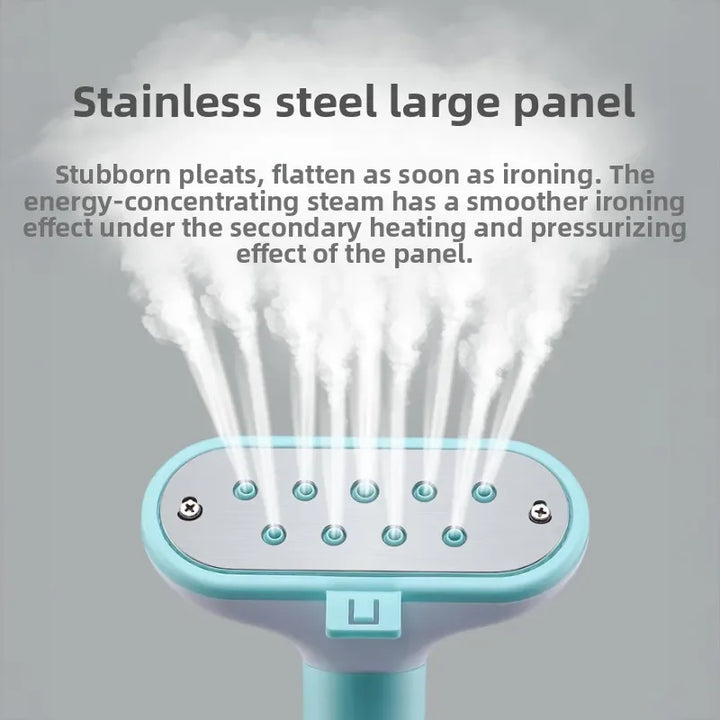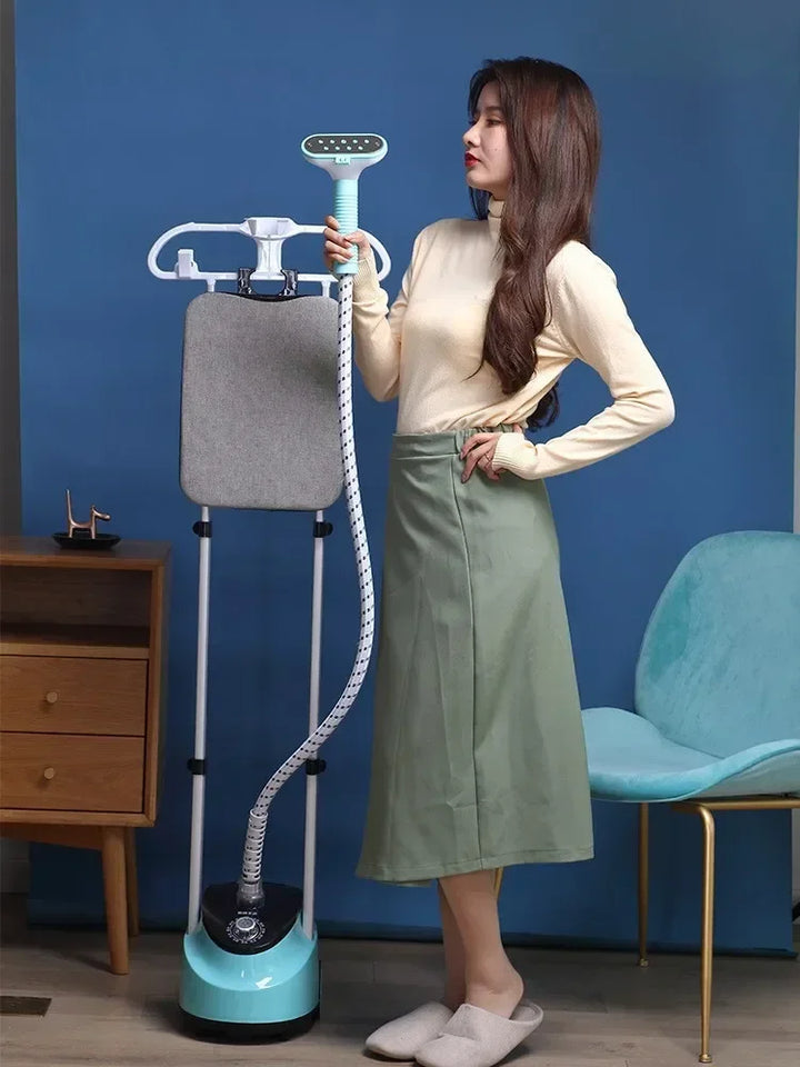 Smart household vertical steam iron with double rod design for stable support and fast heating. Portable and efficient garment steamer with hanging band plate for quick wrinkle removal. Perfect for home or professional clothing care.