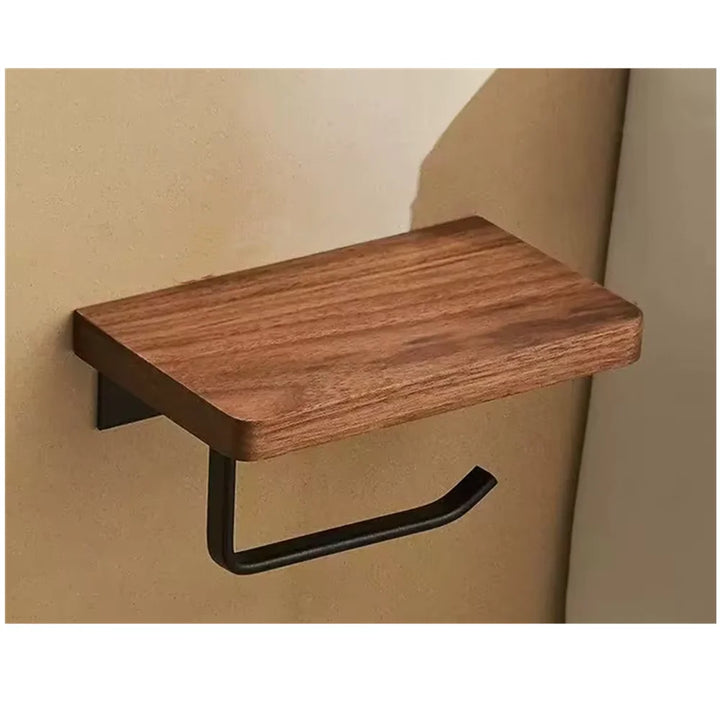 Elegant wall-mounted toilet paper holder made of premium 304 stainless steel with a natural walnut wood shelf. Combines strength and style, offering convenient space for toilet rolls and small bathroom items. Perfect for modern and minimalist spaces.