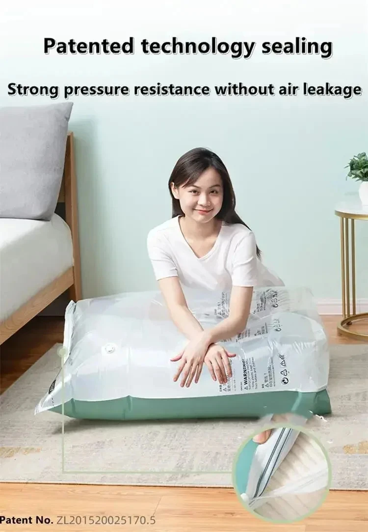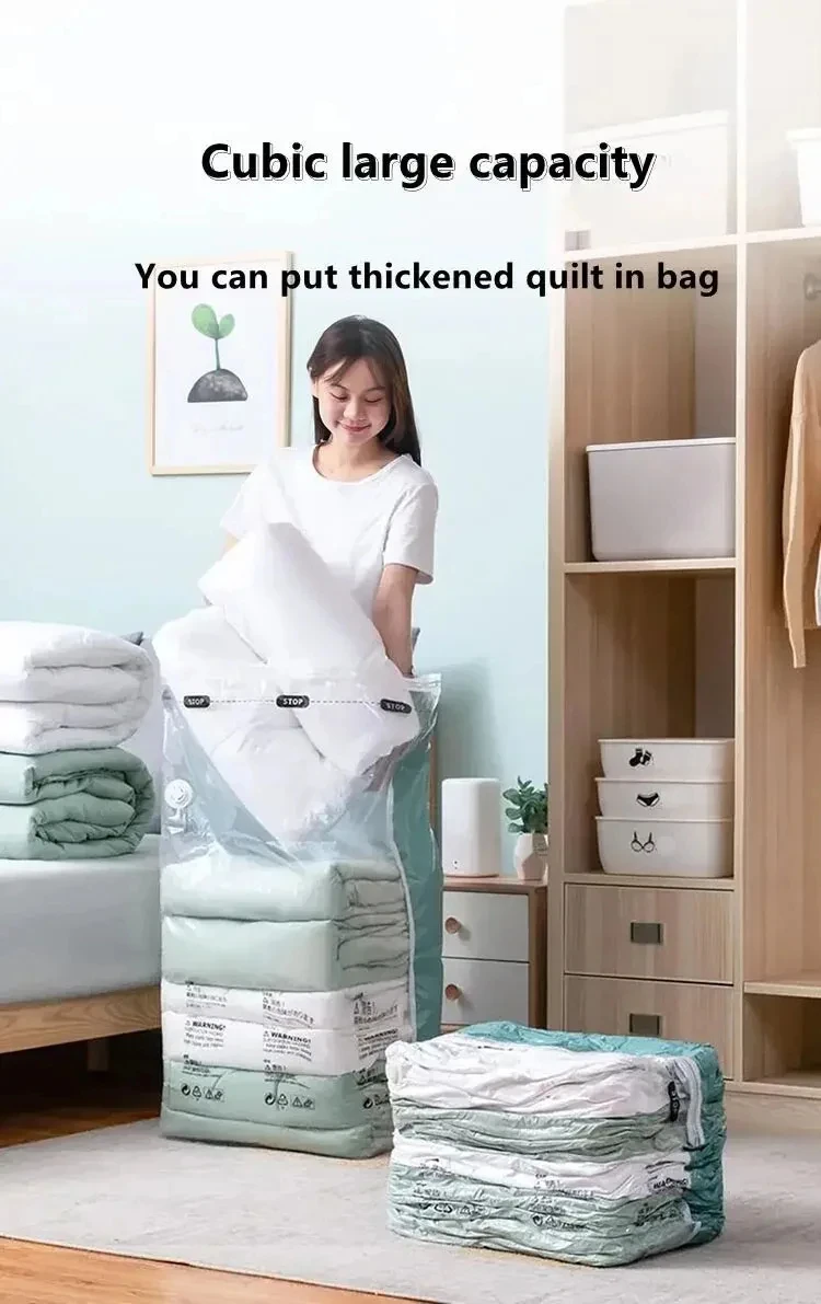 Maximize your storage space with these Large 3D Vacuum Compression Bags. No pump needed — simply seal your clothes, quilts, or bedding to save space while keeping them clean and protected. Durable, reusable, and perfect for home organization or travel.