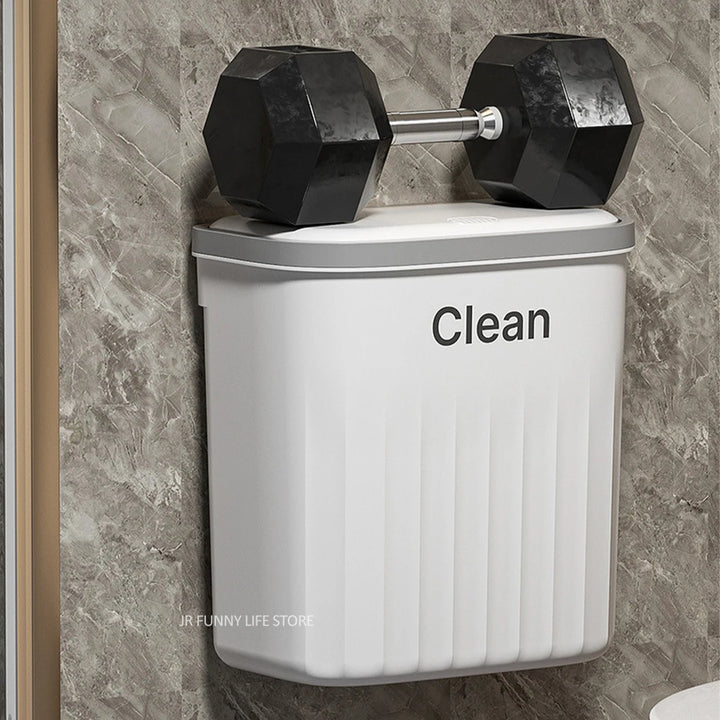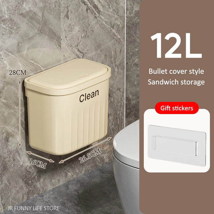12/16L press-type wall-mounted trash can with lid. Ideal for bathroom, kitchen, or toilet. Space-saving, hygienic, and convenient hanging wastebasket for daily use.