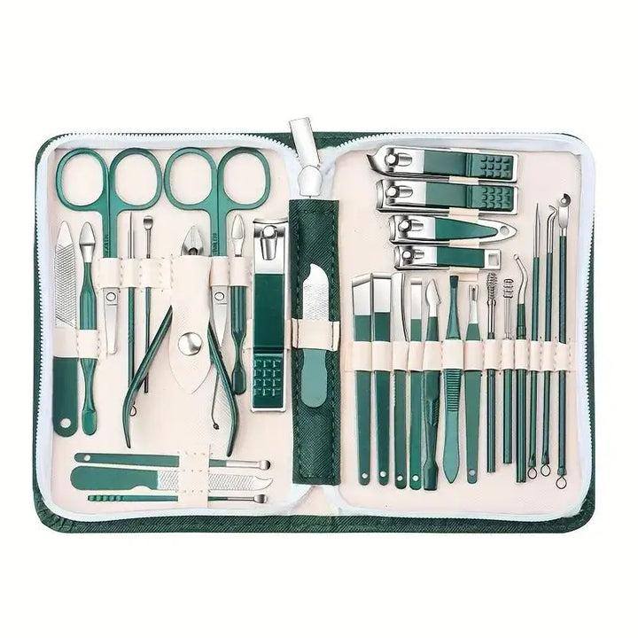 This 30-in-1 professional manicure kit includes stainless steel nail clippers and essential grooming tools for men and women, all neatly organized in a portable travel case. Perfect for home use or on-the-go nail care.